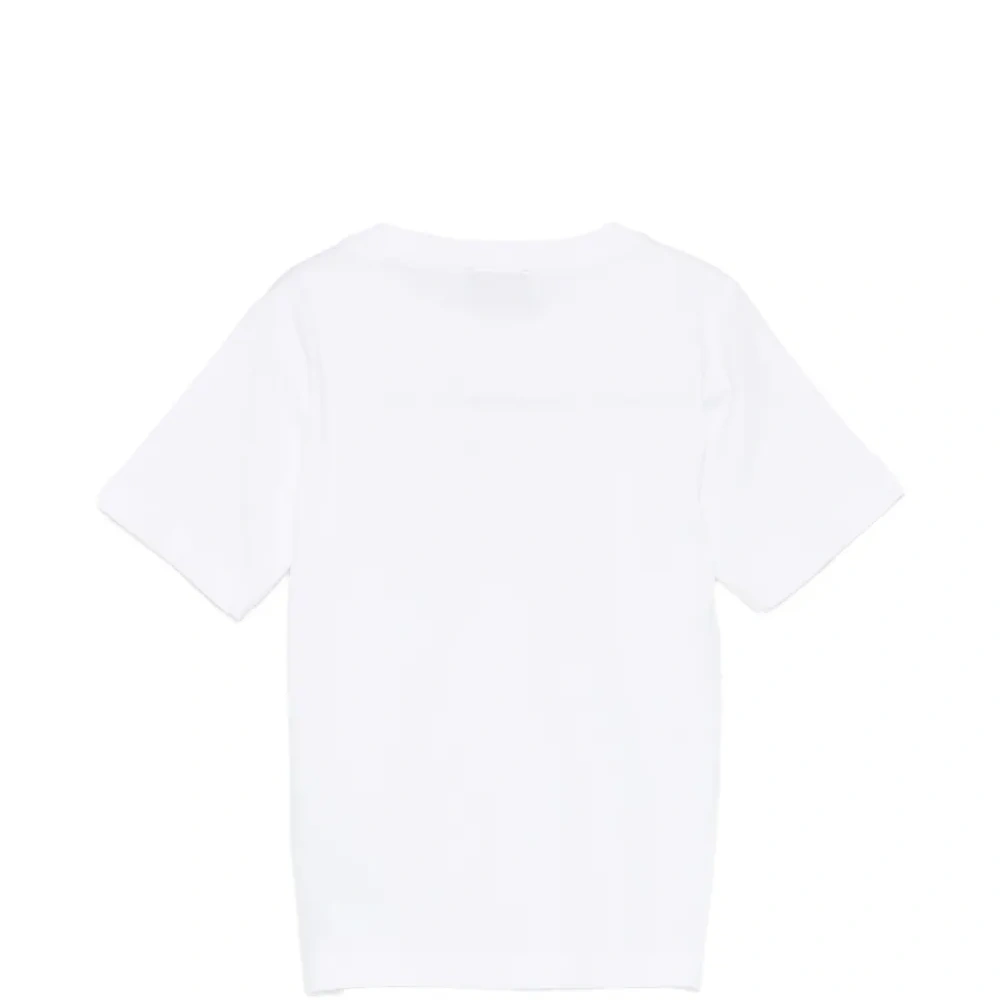 белая футболка с логотипом, круглым вырезом и короткими рукавами