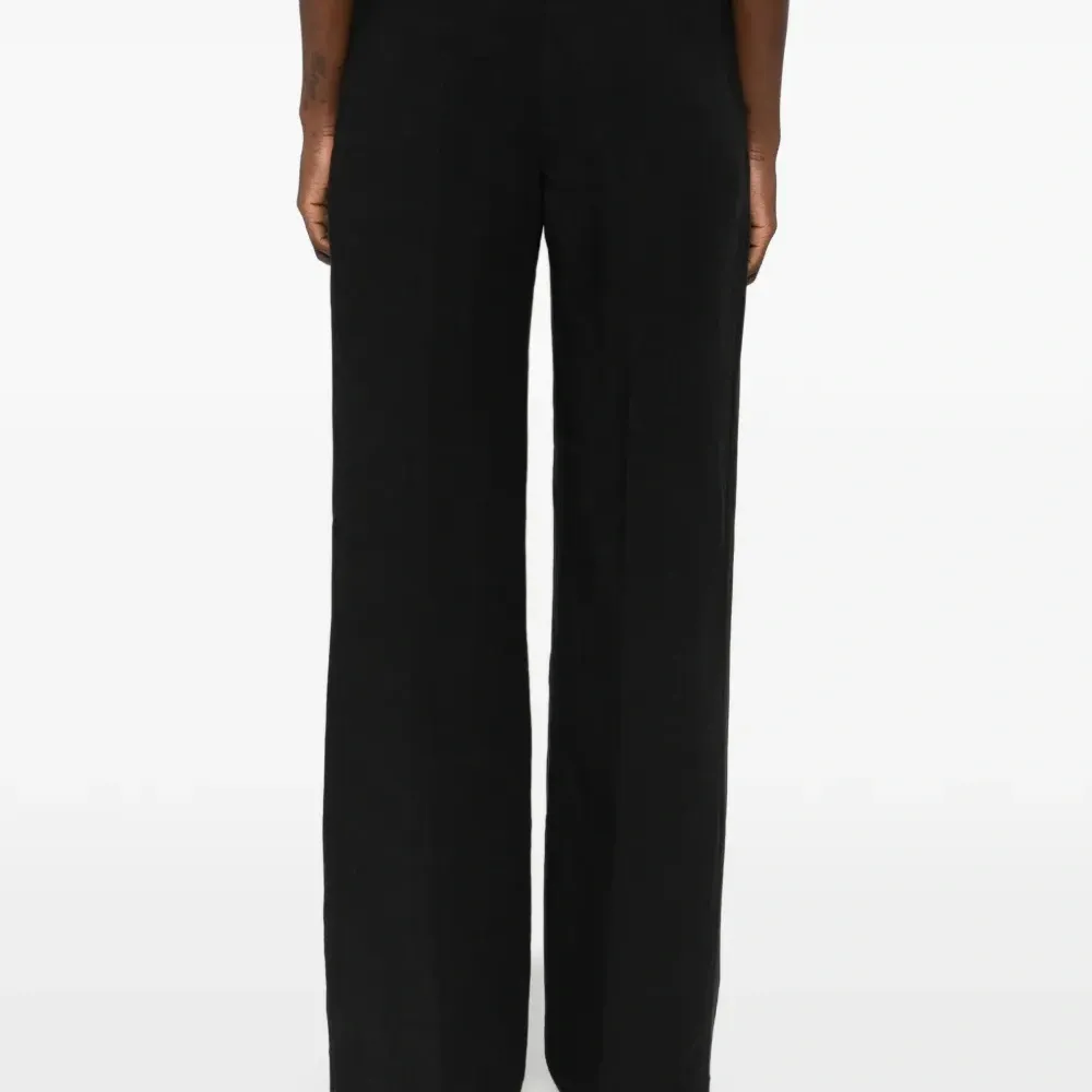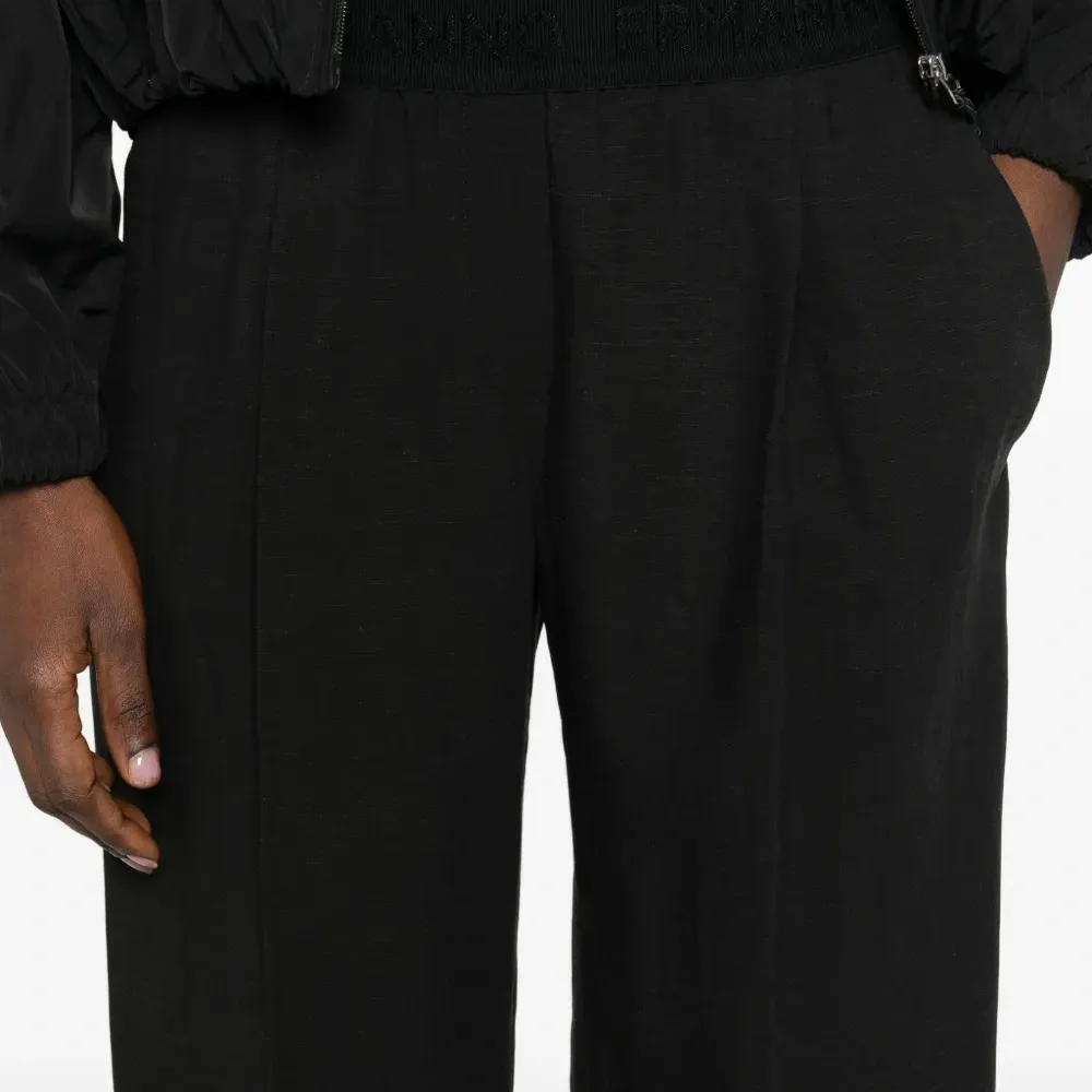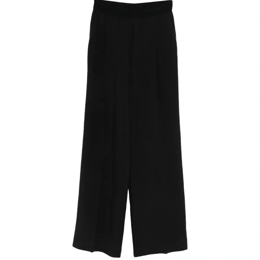 черные широкие брюки с логотипом, эластичным поясом, прорезными карманами и отделочной прострочкой