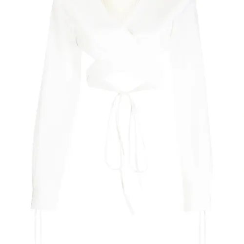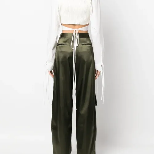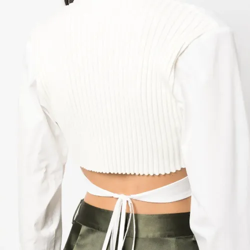 Цвет слоновой кости, смесовый хлопок, классический воротник, V-образный вырез, кулиска на талии, застежка на завязке сзади, длинные рукава, манжеты с завязками и укороченная длина.