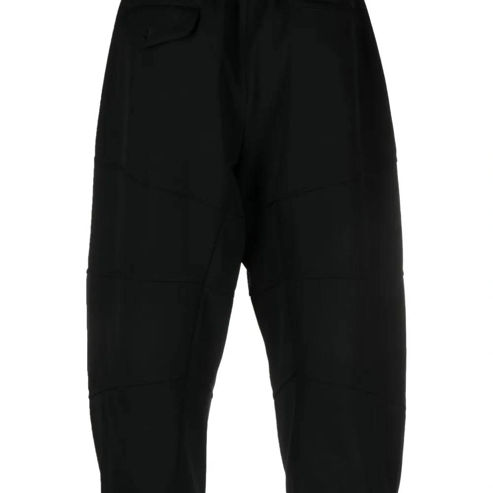 Черный, шерсть, эластичный пояс, два прорезных кармана по бокам, карман с клапаном сзади, низкий шаговый шов, зауженный крой, укороченная длина и прямой подол.