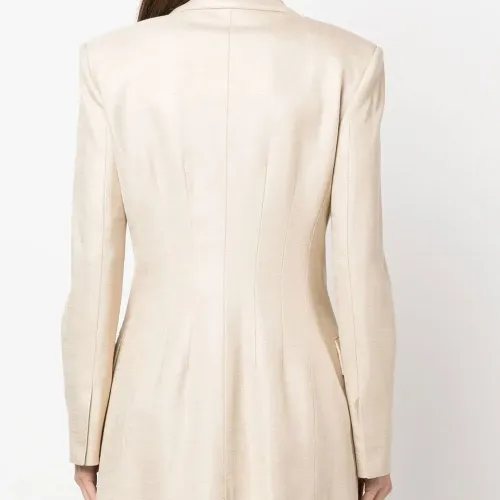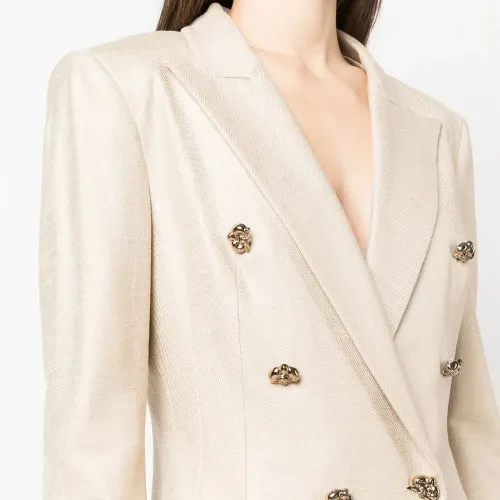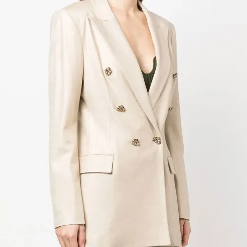 Бежевый, двубортная застежка на кнопки, отложный воротник, зазубренные лацканы, два прорезных кармана спереди, длинные рукава и декоративные пуговицы.