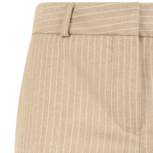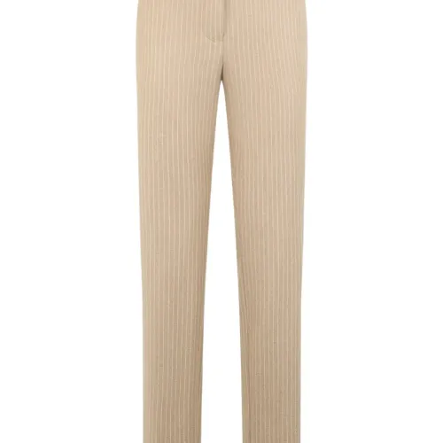 бежевый с узором в тонкую полоску, шлевки для ремня, передние карманы, задние прорезные карманы, застежка с потайной планкой