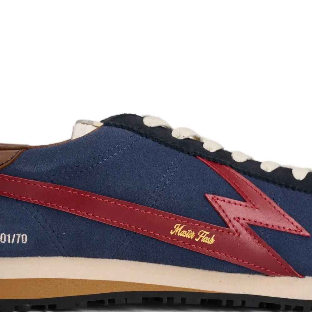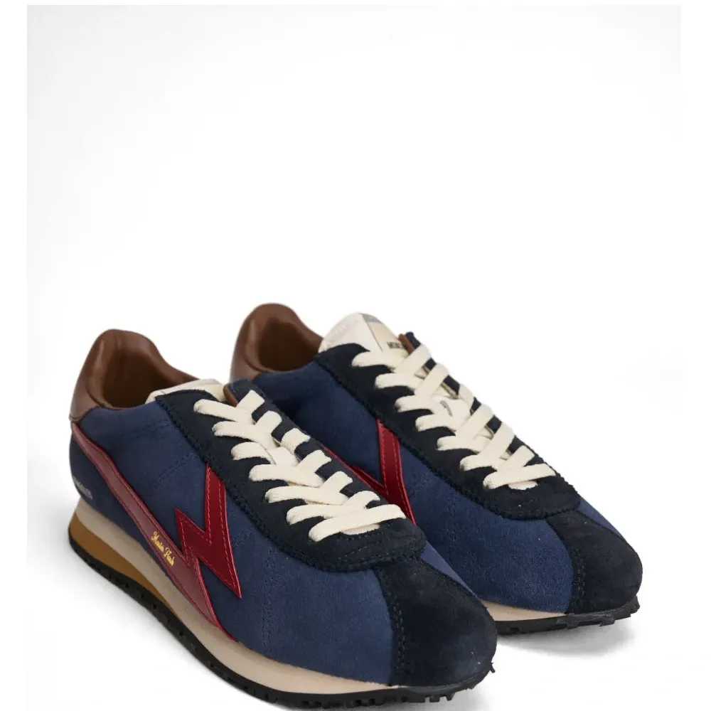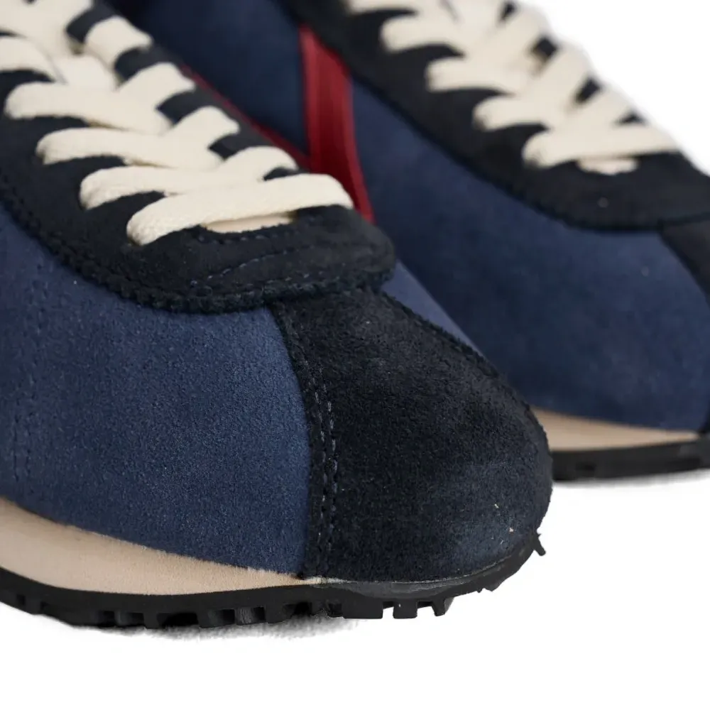 темно-синие кроссовки с красной молнией, декоративной отстрочкой, фирменной стелькой, округлым носком и контрастной пяткой