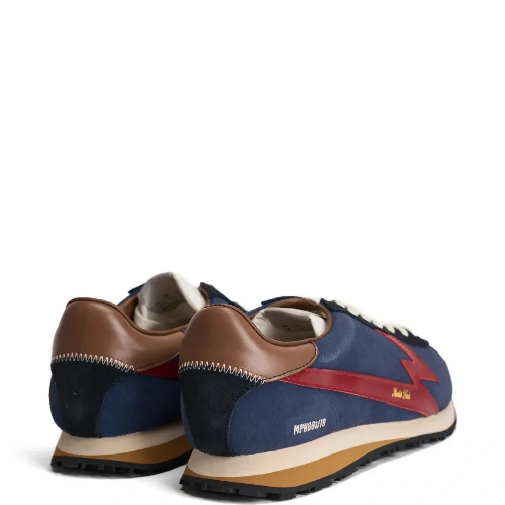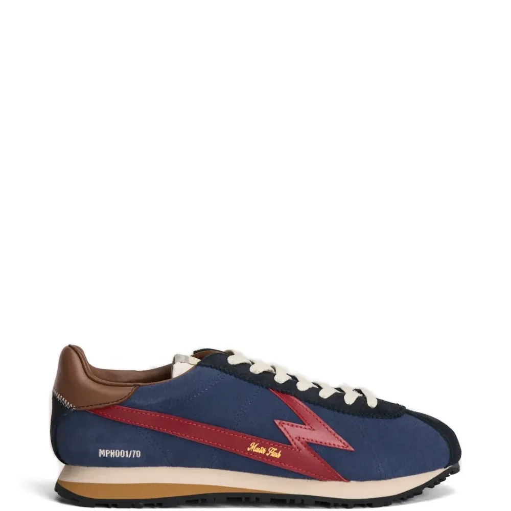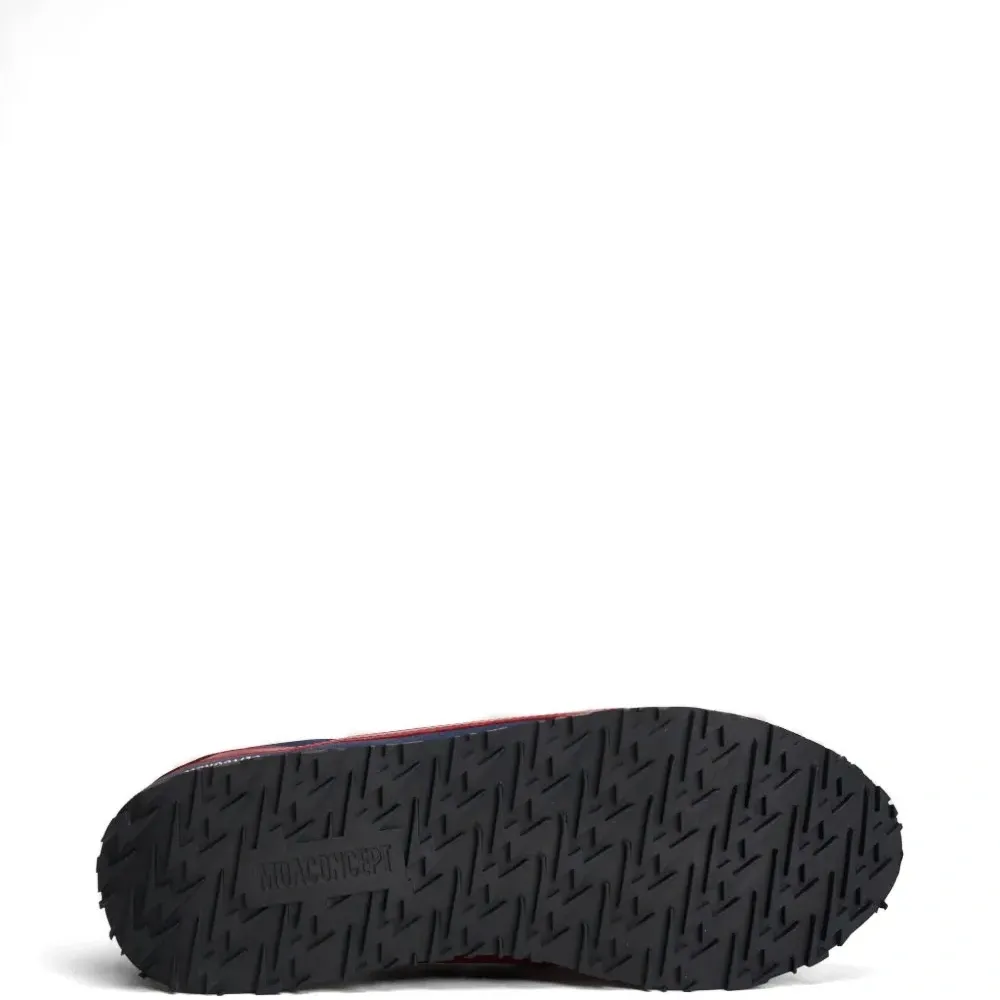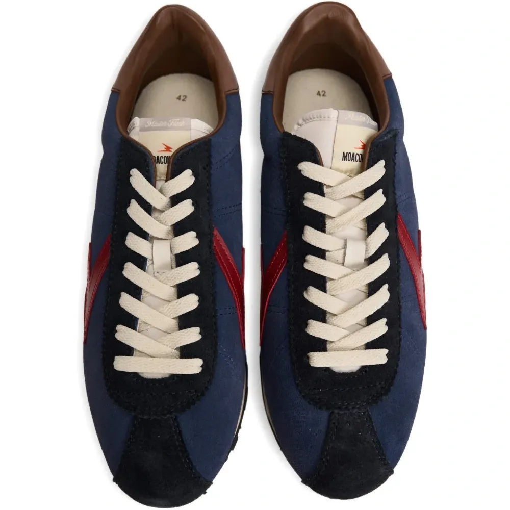 темно-синие кроссовки с красной молнией, декоративной отстрочкой, фирменной стелькой, округлым носком и контрастной пяткой