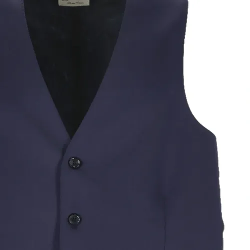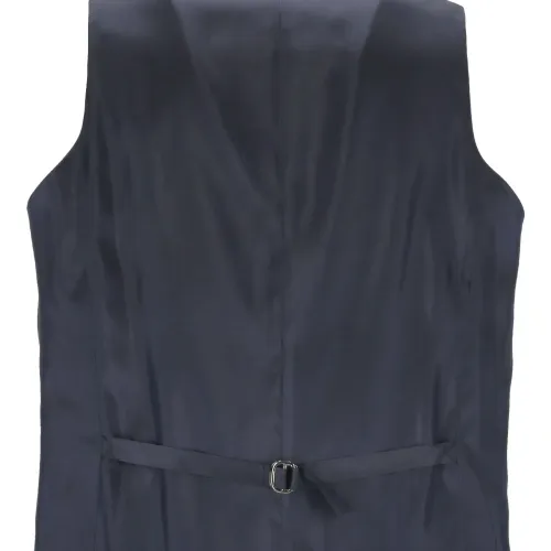 тёмно-синий жилет с V-образным вырезом, застёжкой на пуговицы, передними клапанными карманами и регулируемым ремешком на спине