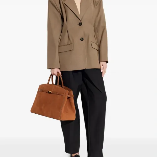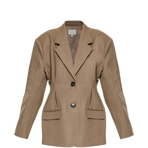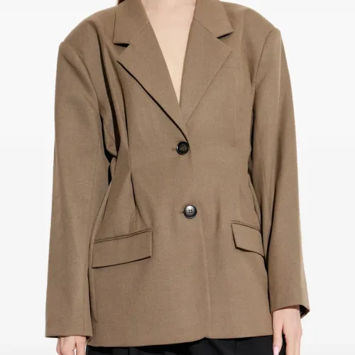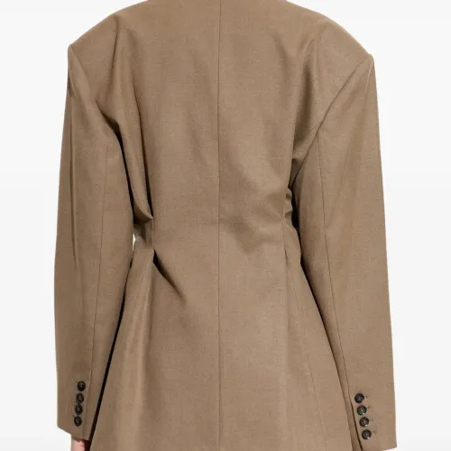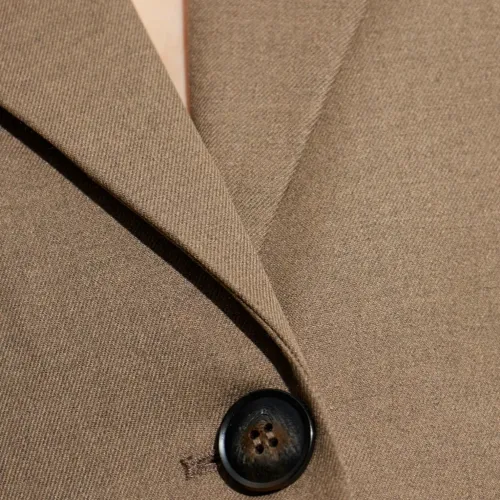 коричневый однобортный пиджак с застежкой на пуговицы, длинными рукавами и приталенной талией