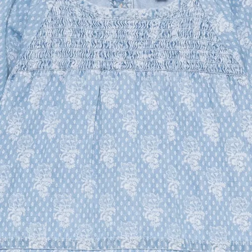 светло-голубой с цветочным принтом, с отделкой в технике смок, округлым вырезом, длинными рукавами и манжетами с оборками