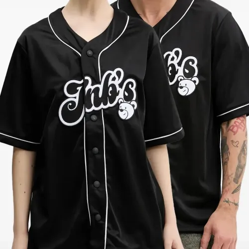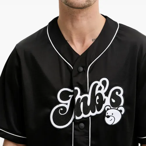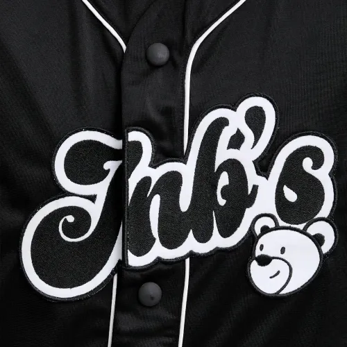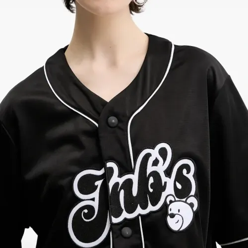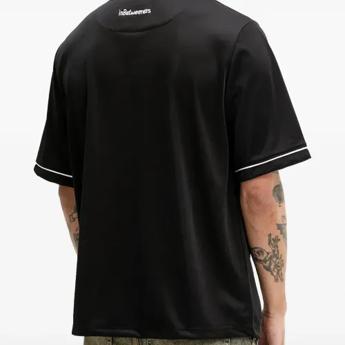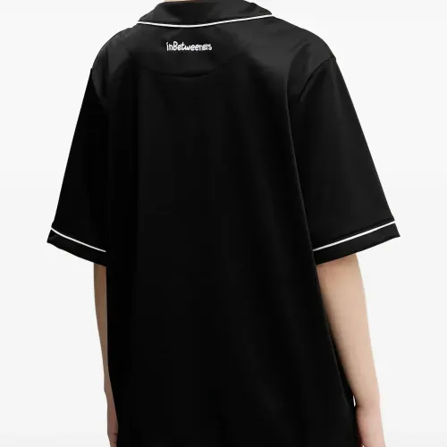черная футболка с V-образным вырезом, застежкой на пуговицы, короткими рукавами и отделкой по краям с аппликацией