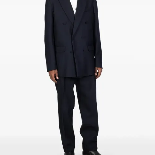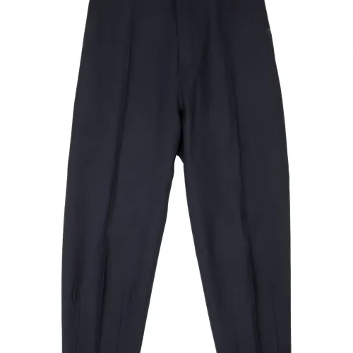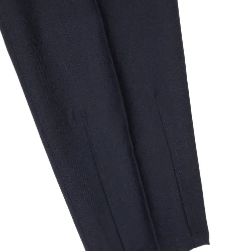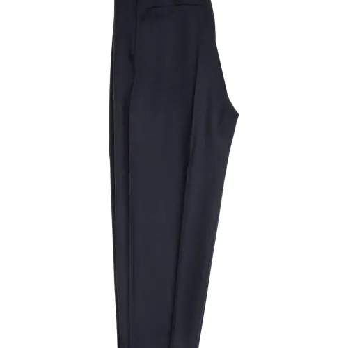 темно-синий цвет, эластичный пояс, задний прорезной карман, разрезы на щиколотках, декоративные швы