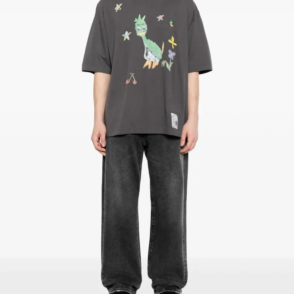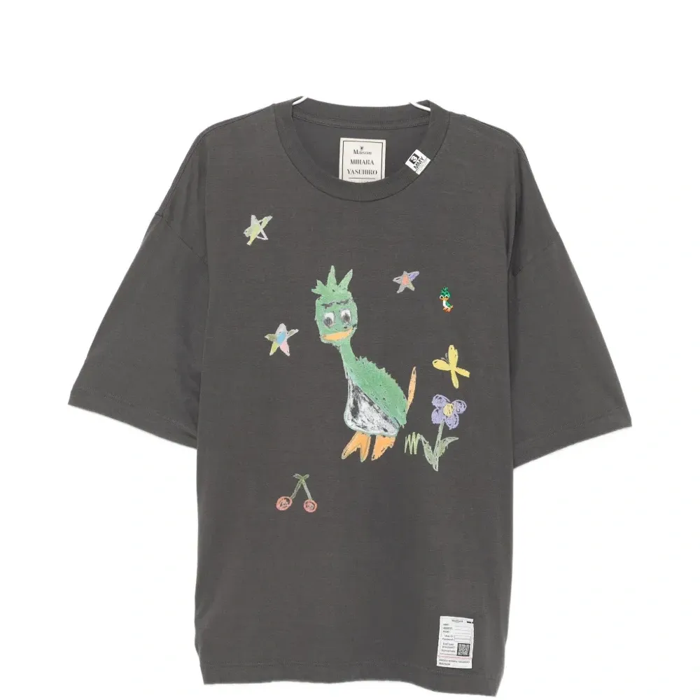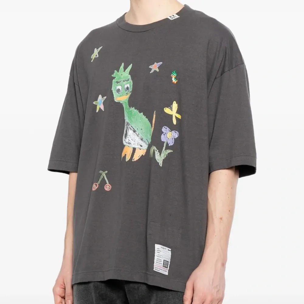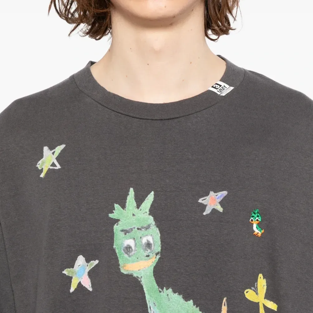 черная футболка с графическим принтом, круглый вырез, короткие рукава, бирка на задней части ворота