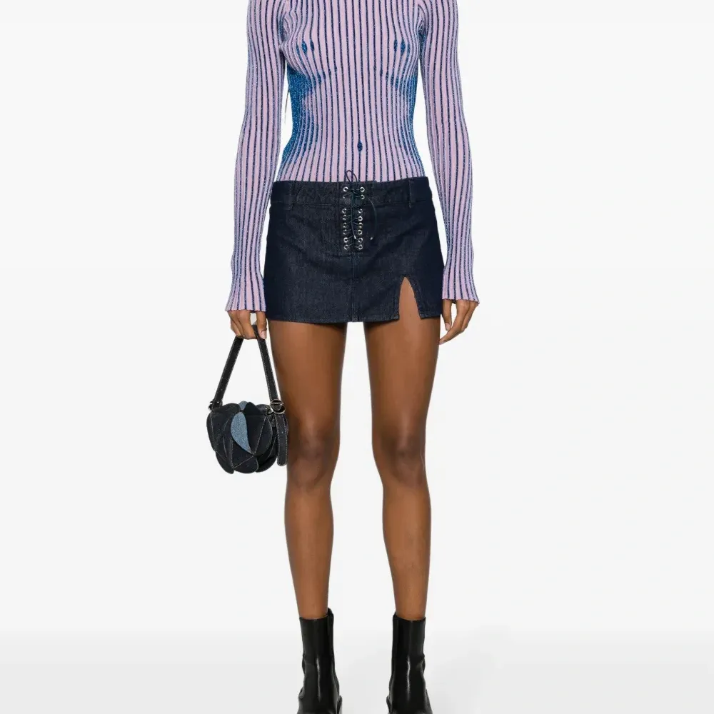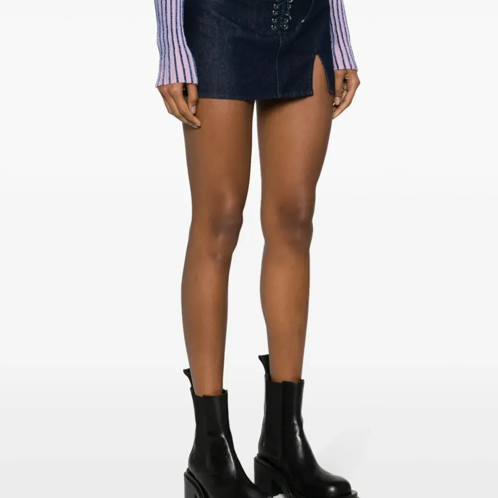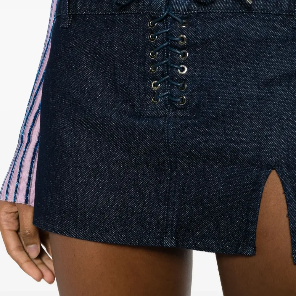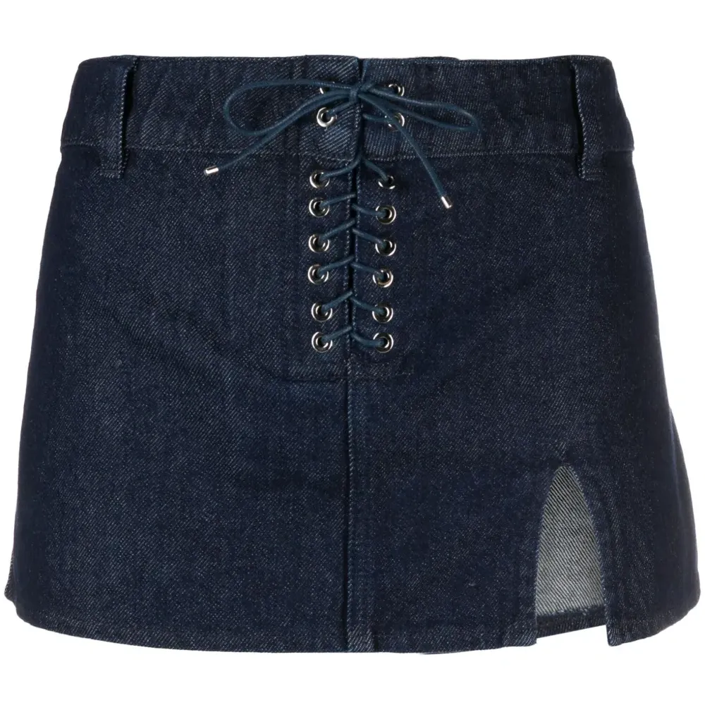 Индиго, хлопок, деним, боковой разрез, логотип, низкая посадка, кулиска, петли для ремня, длина до бедер и прямой подол.
