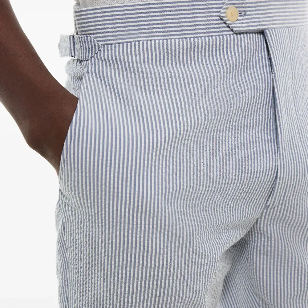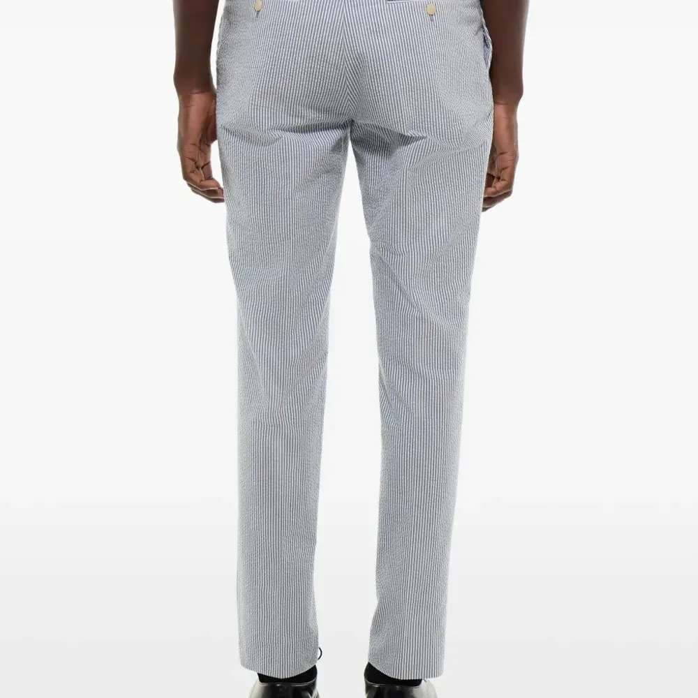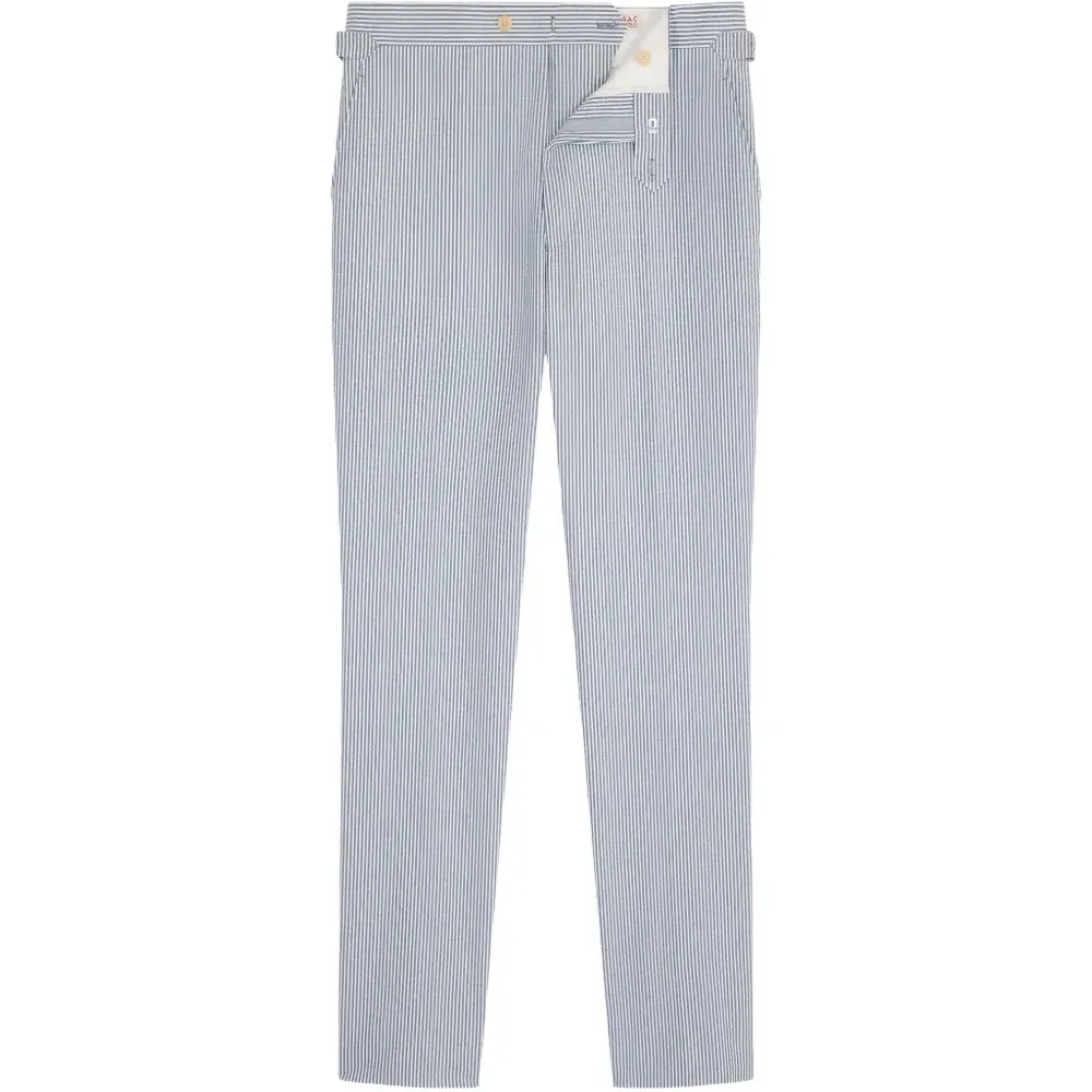 голубой с полосатыми деталями, шлёвки для ремня, застёжка спереди на пуговицу и молнию
