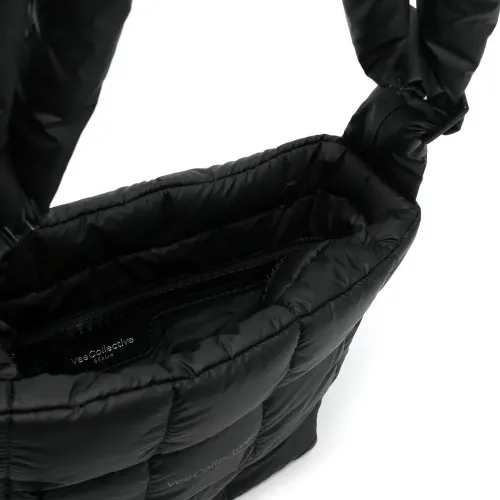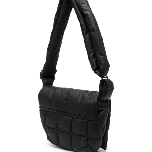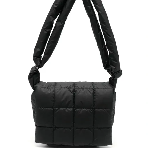 Черный, переработанный нейлон, дутый материал, откидной клапан и регулируемый ремень на плечо.
