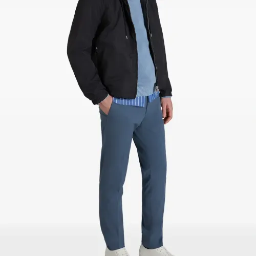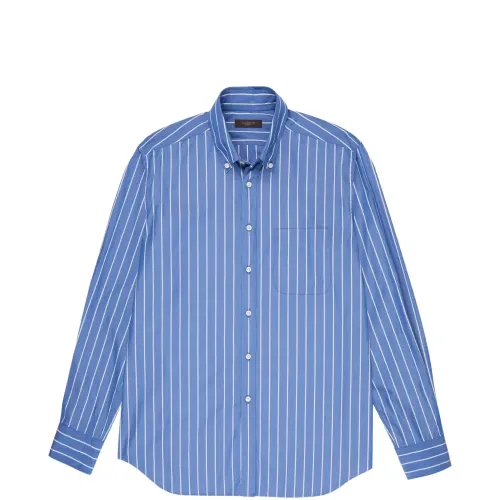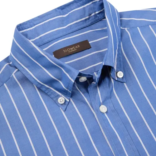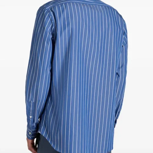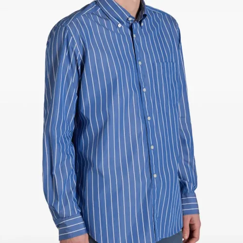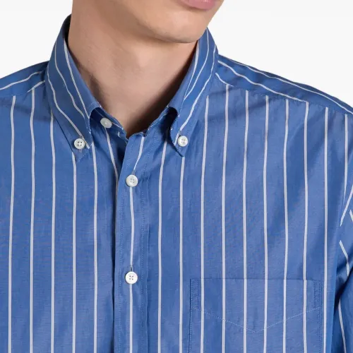 средне-синий цвет, полосатый узор, застежка на пуговицы, воротник на пуговицах, накладной карман на груди, длинные рукава