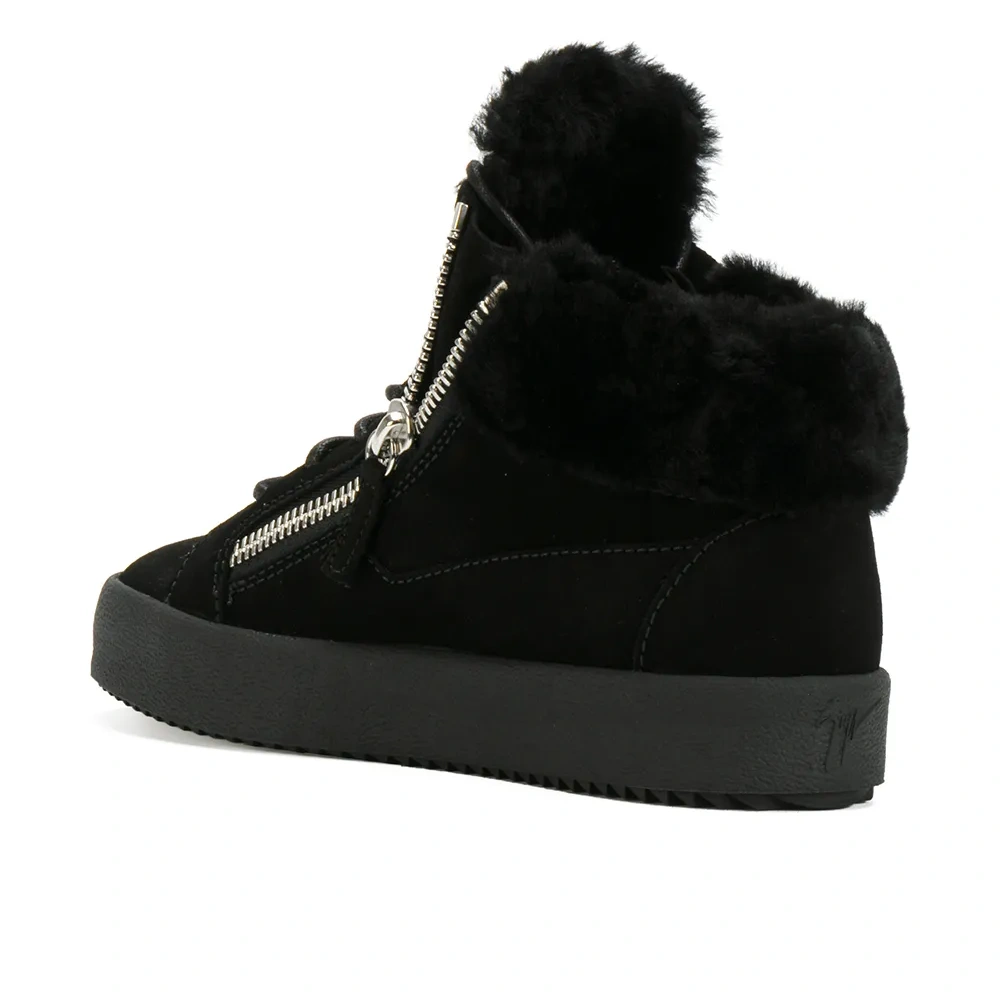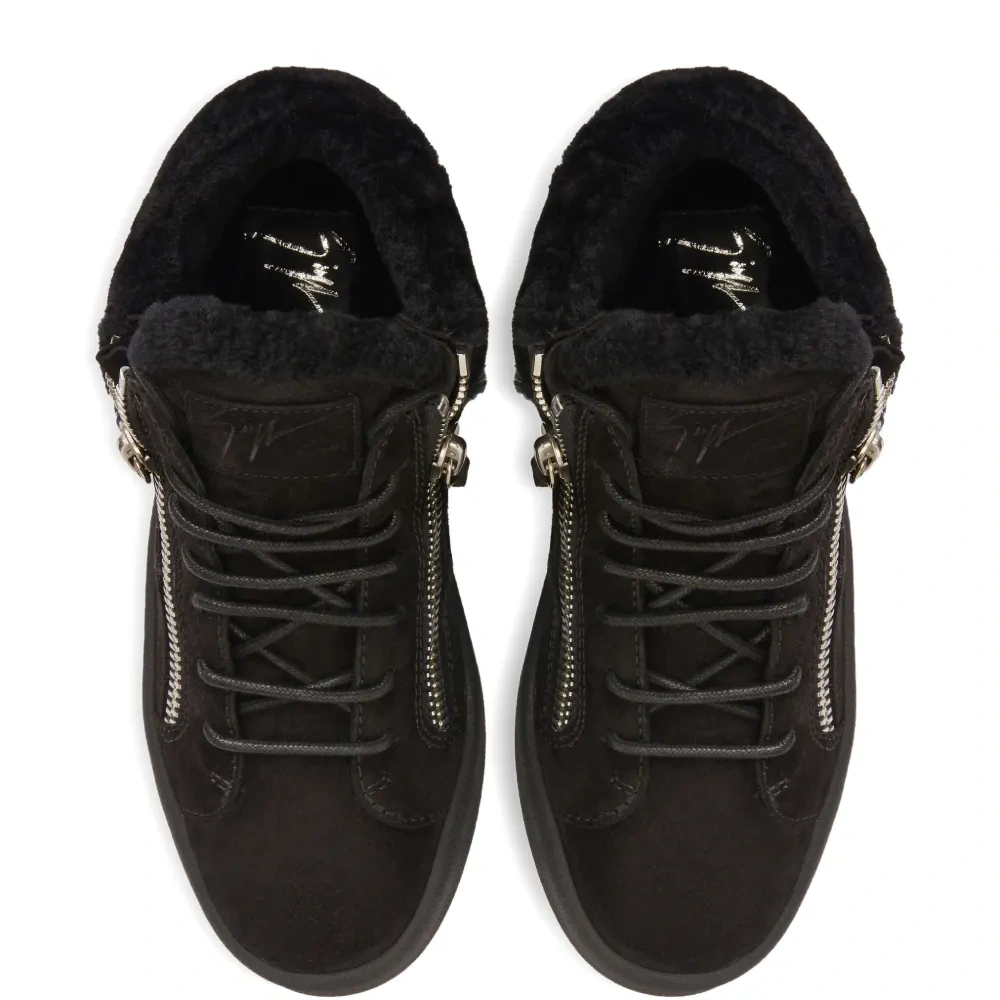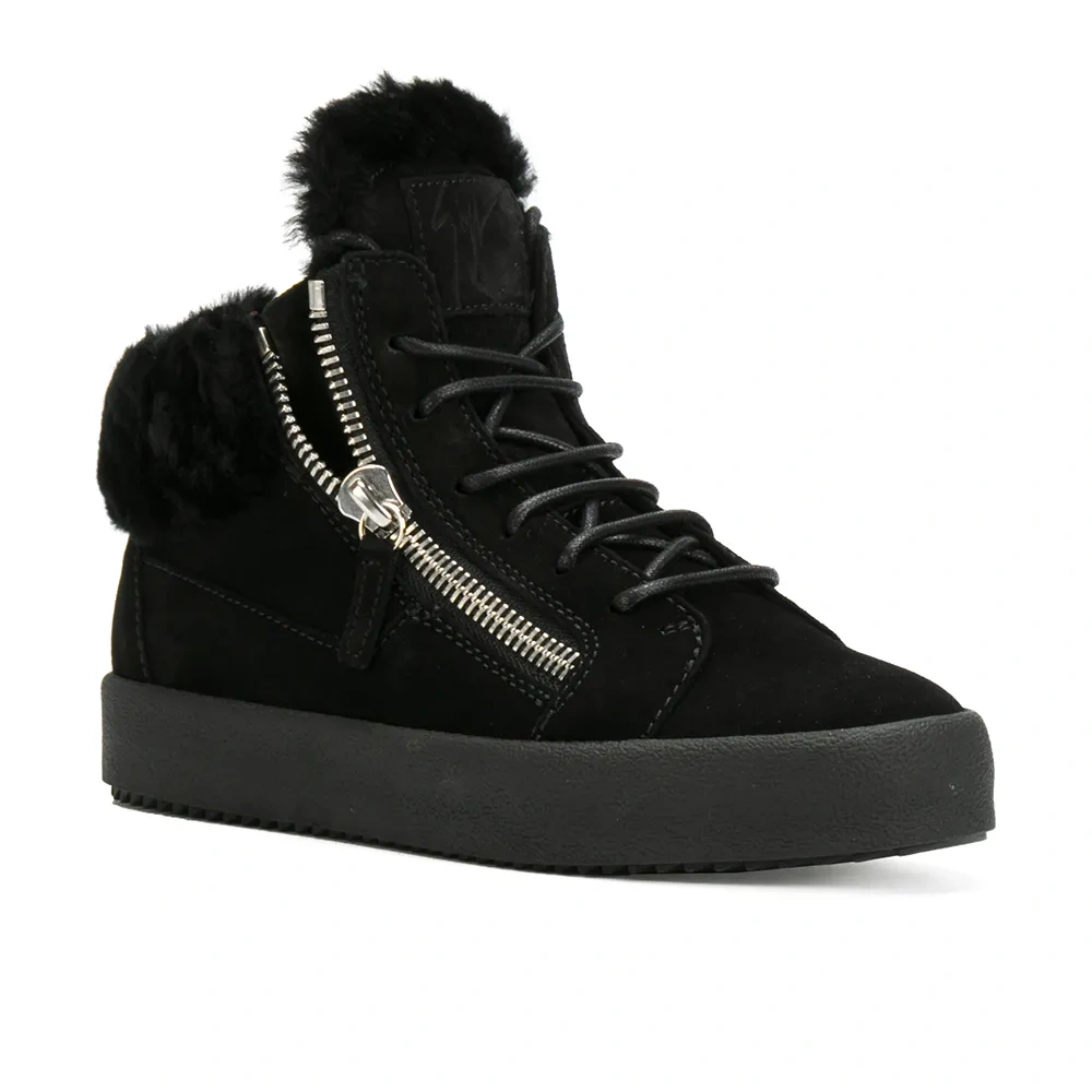 The seditious sneaker silhouettes of Giuseppe Zanotti Design welcome a new favourite with this suede and lamb fur mid-top, featuring a round toe, a lace fastening, side zip details, a fur trim and a ridged rubber sole.