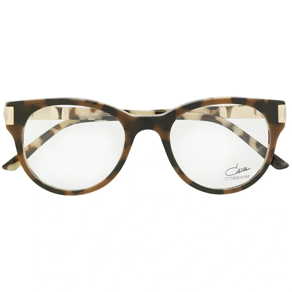 Очки в круглой оправе от Cazal. Эффект черепашьего панциря, логотип на дужке и прямые дужки с изогнутыми концами. Прилагается защитный чехол.