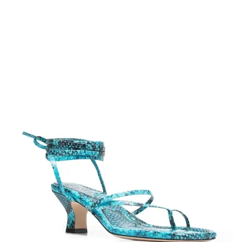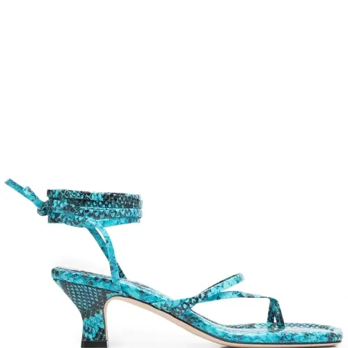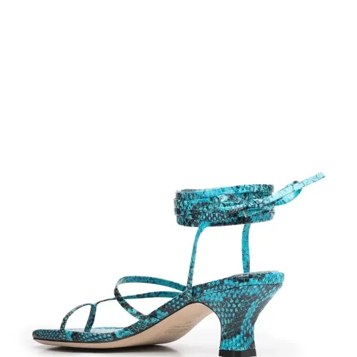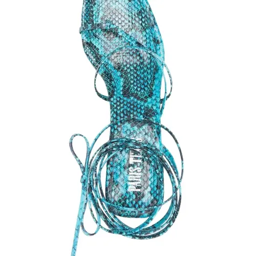 Синий, Кожа, сплошной принт под змеиную кожу, браслет в несколько оборотов, застежка на узел, открытый носок и скульптурный каблук средней высоты.