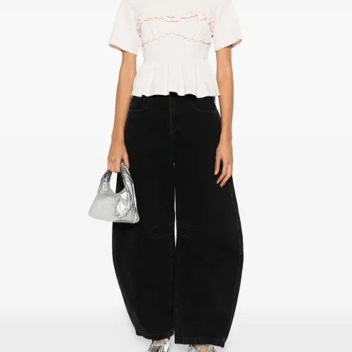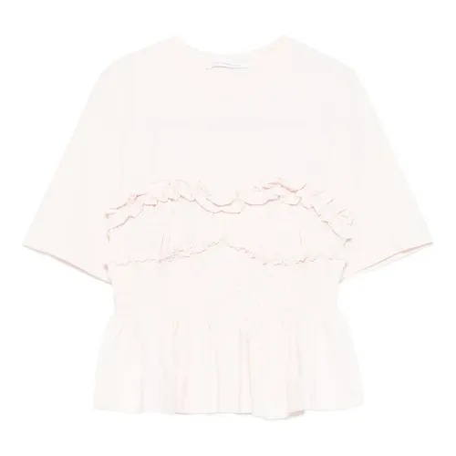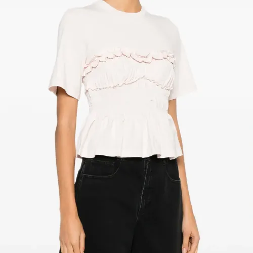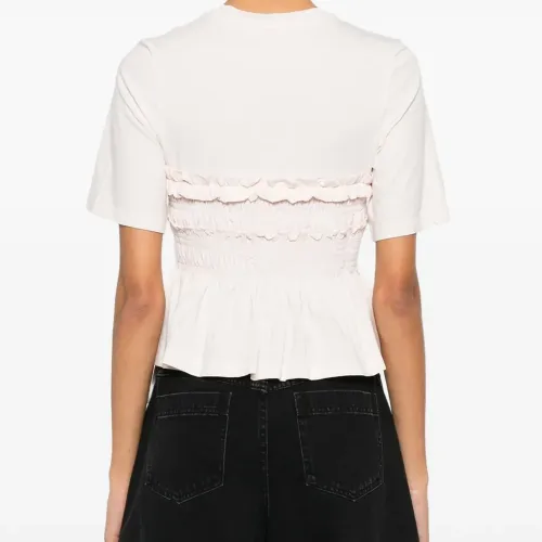 светло-розовая блузка с оборками, сборками, круглым вырезом и короткими рукавами