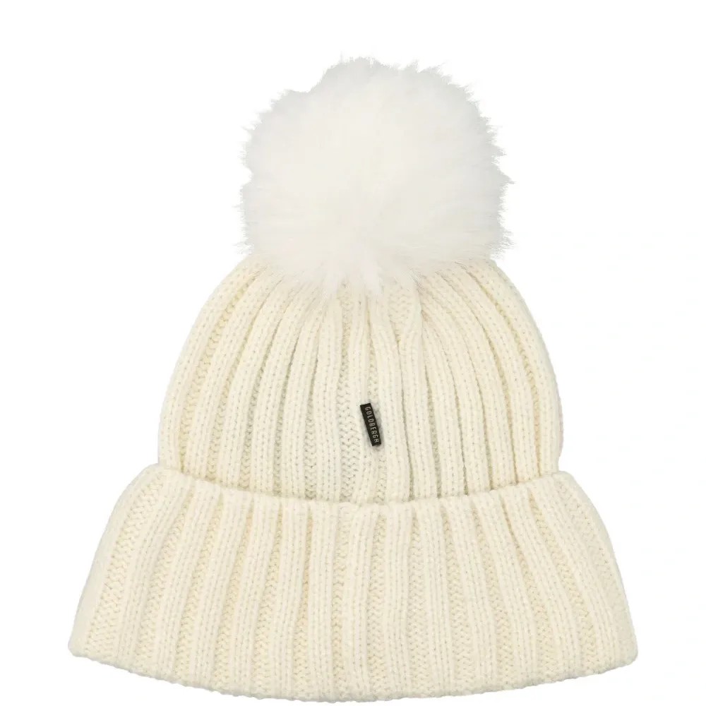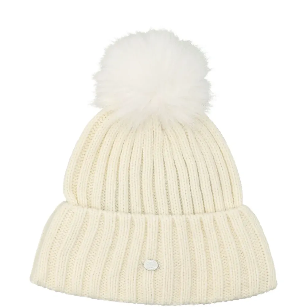 бежевый вязаный трикотаж с ребристой фактурой, помпон, отворот, логотип