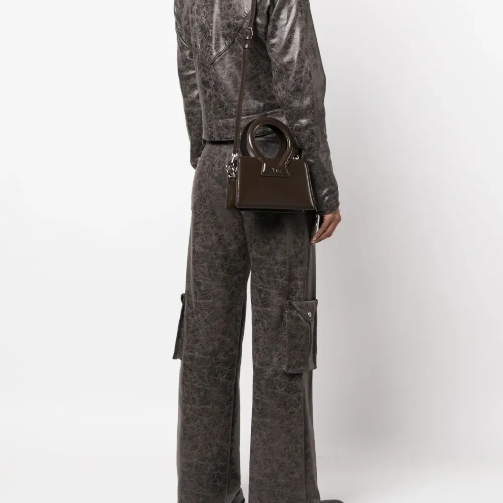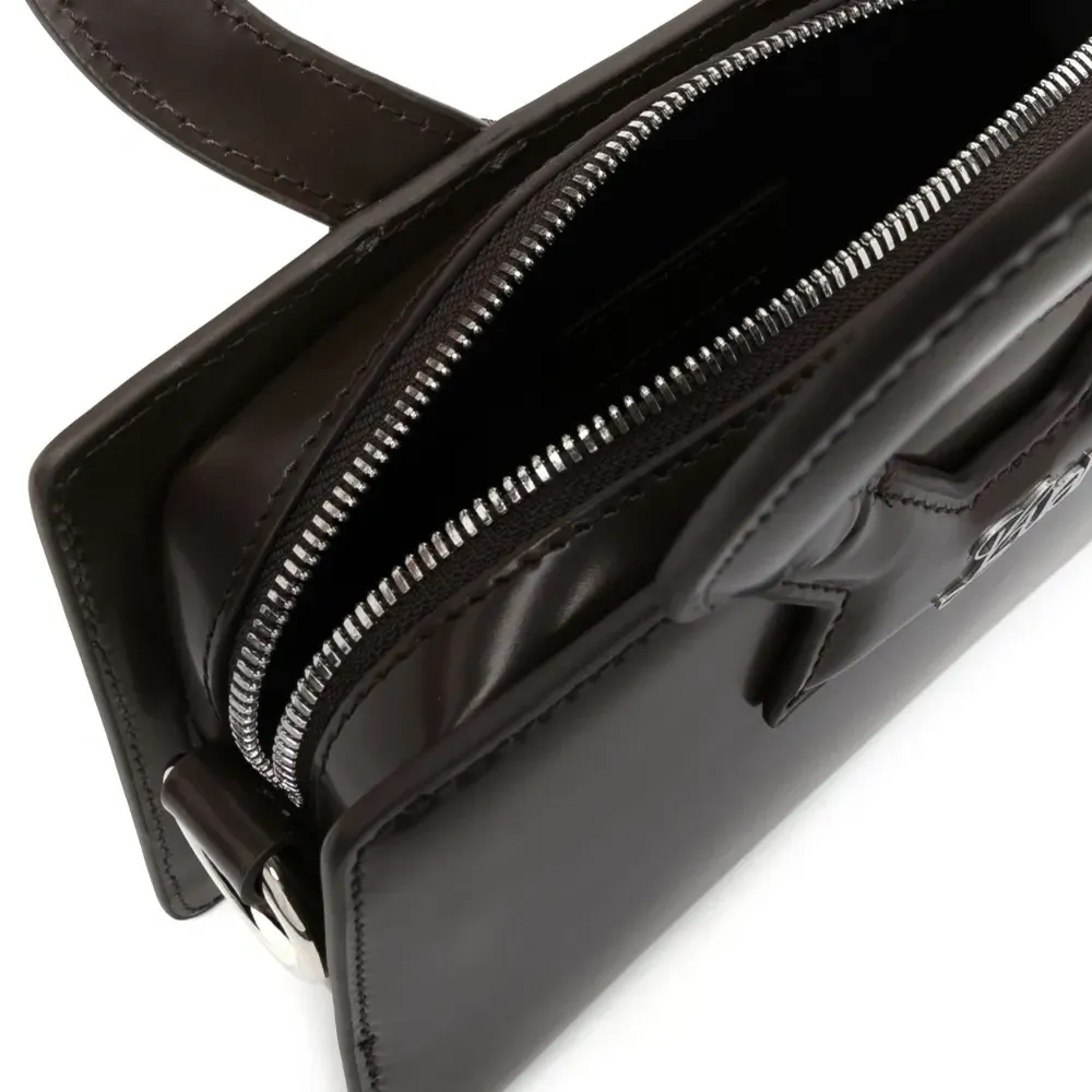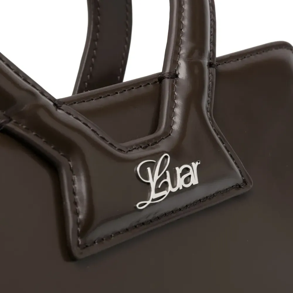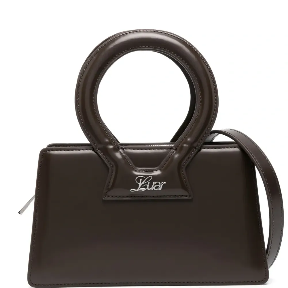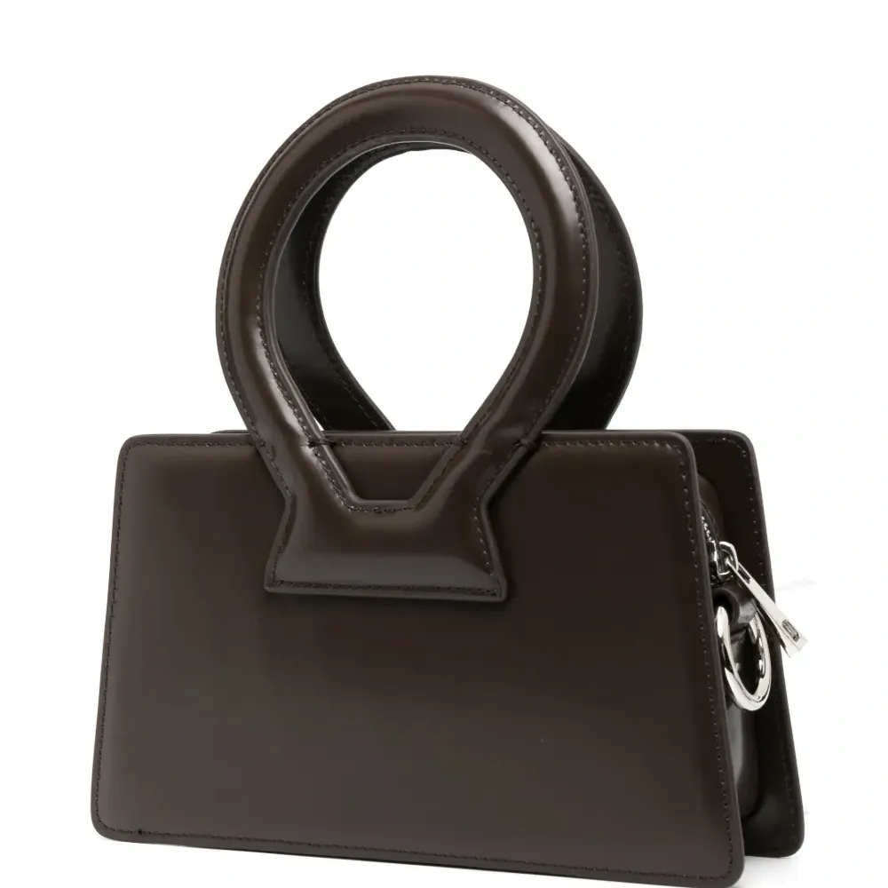 Шоколадный, телячья кожа, серебристый логотип, застежка на молнии сверху, круглые ручки, съемный ремень на плечо и основное отделение.