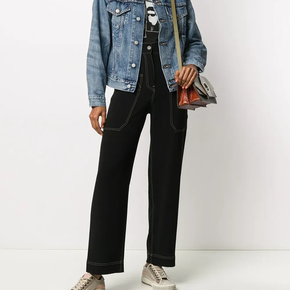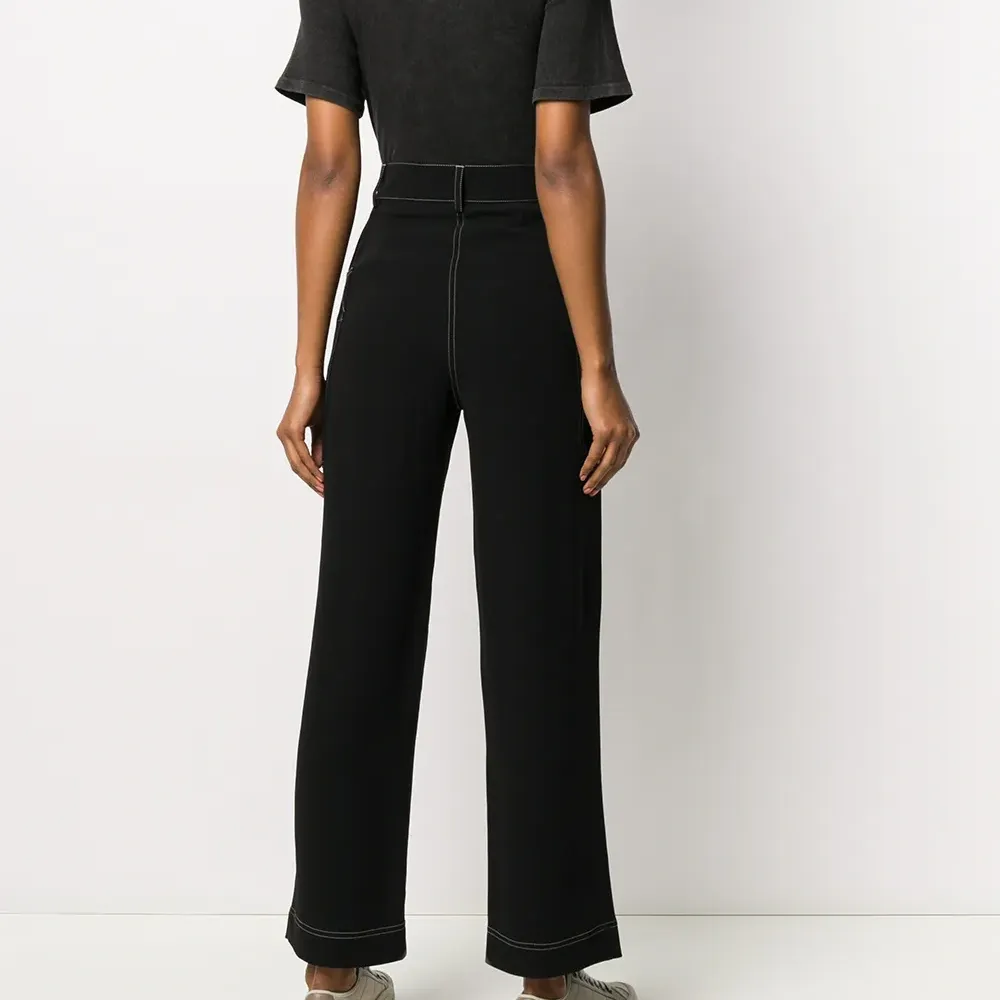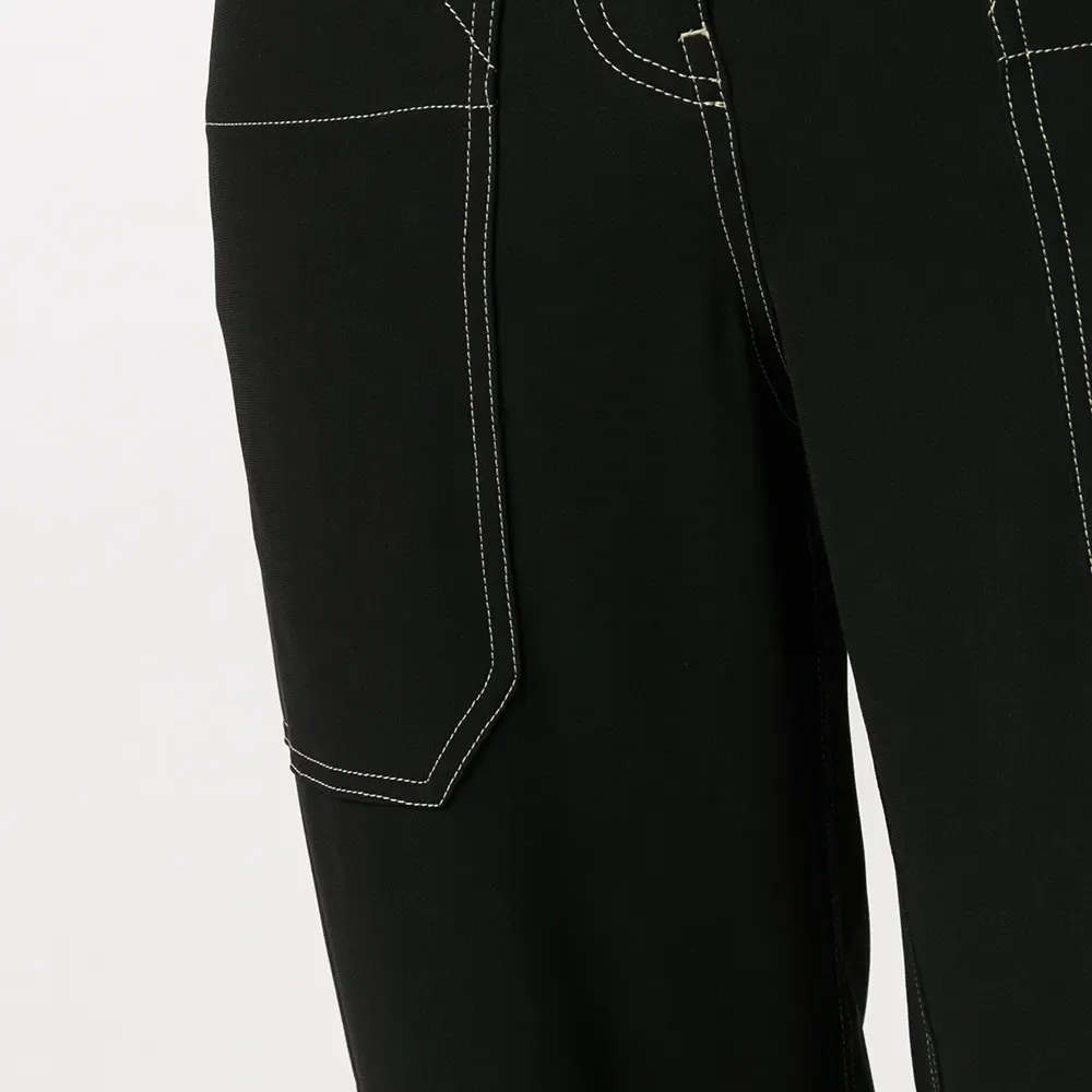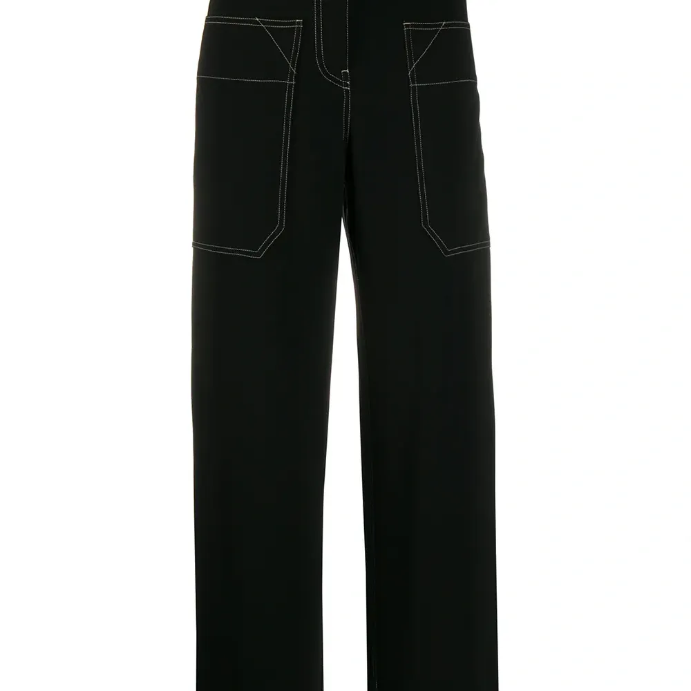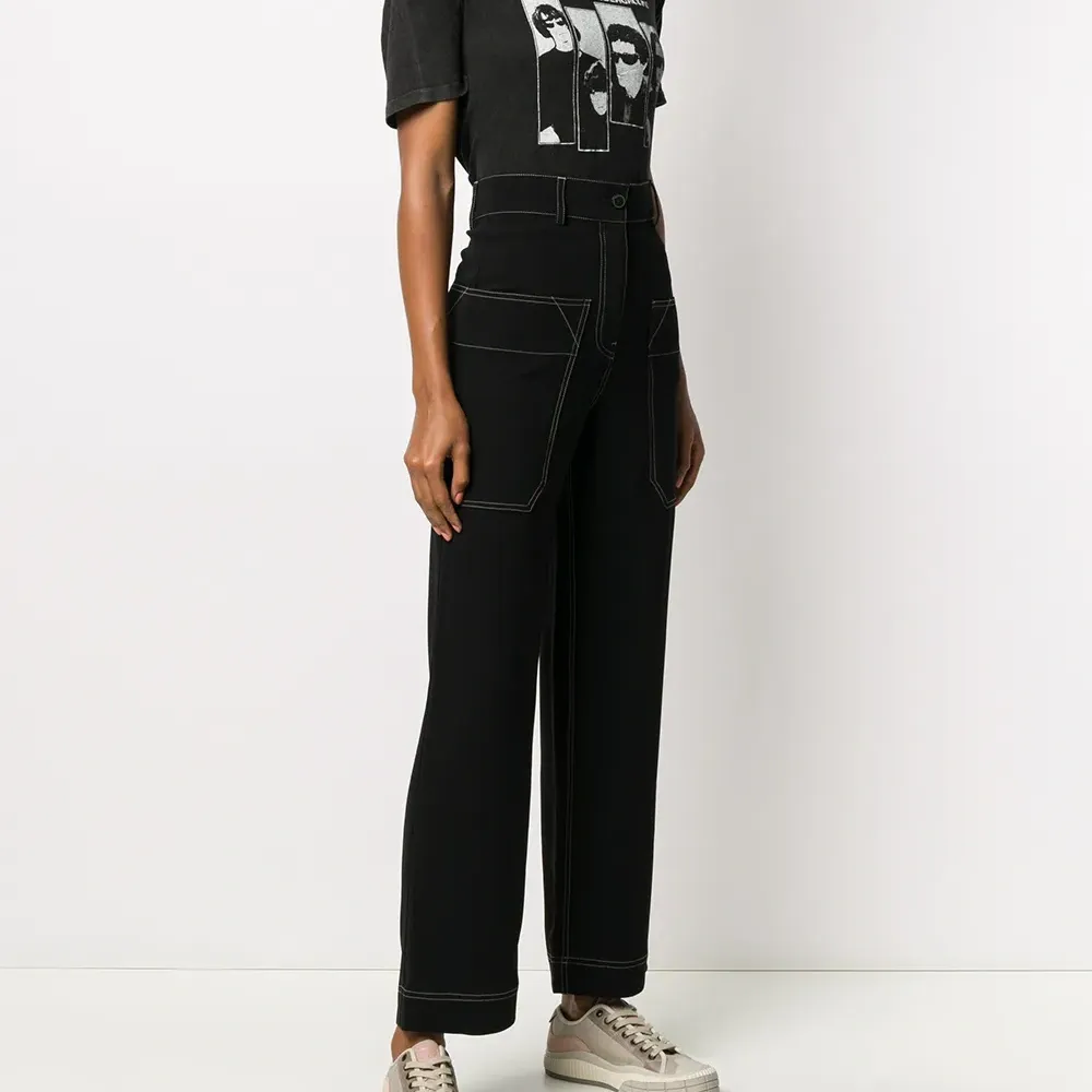 Завышенная талия, петли для ремня, застежка на молнии и пуговице спереди, два накладных кармана по бокам, прямой крой и контрастная строчка. Цвет: черный.
