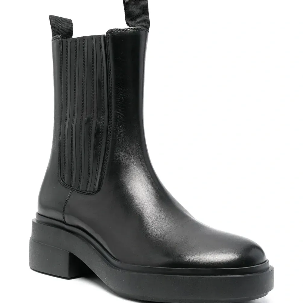 Черный, телячья кожа, эластичные боковые вставки, петля для подтягивания сзади, закругленный носок, массивная резиновая подошва и низкий каблук.