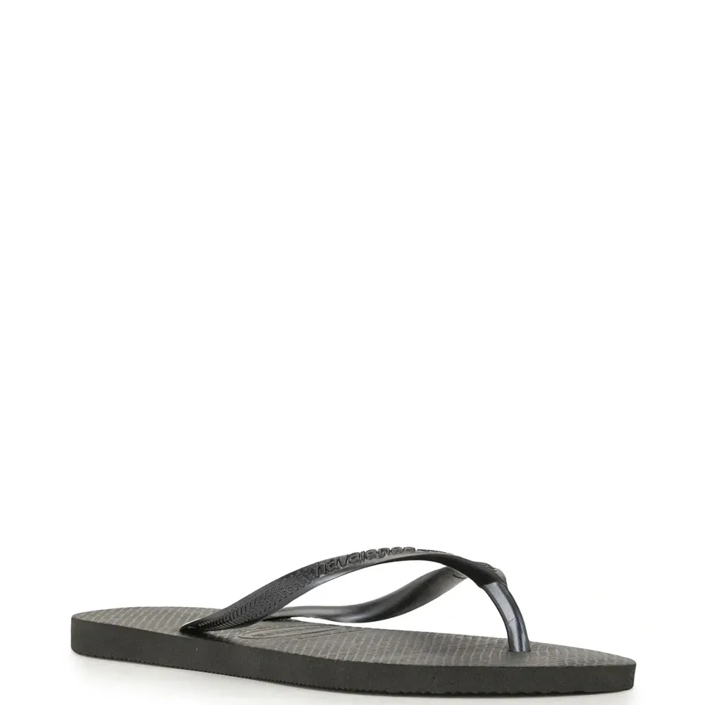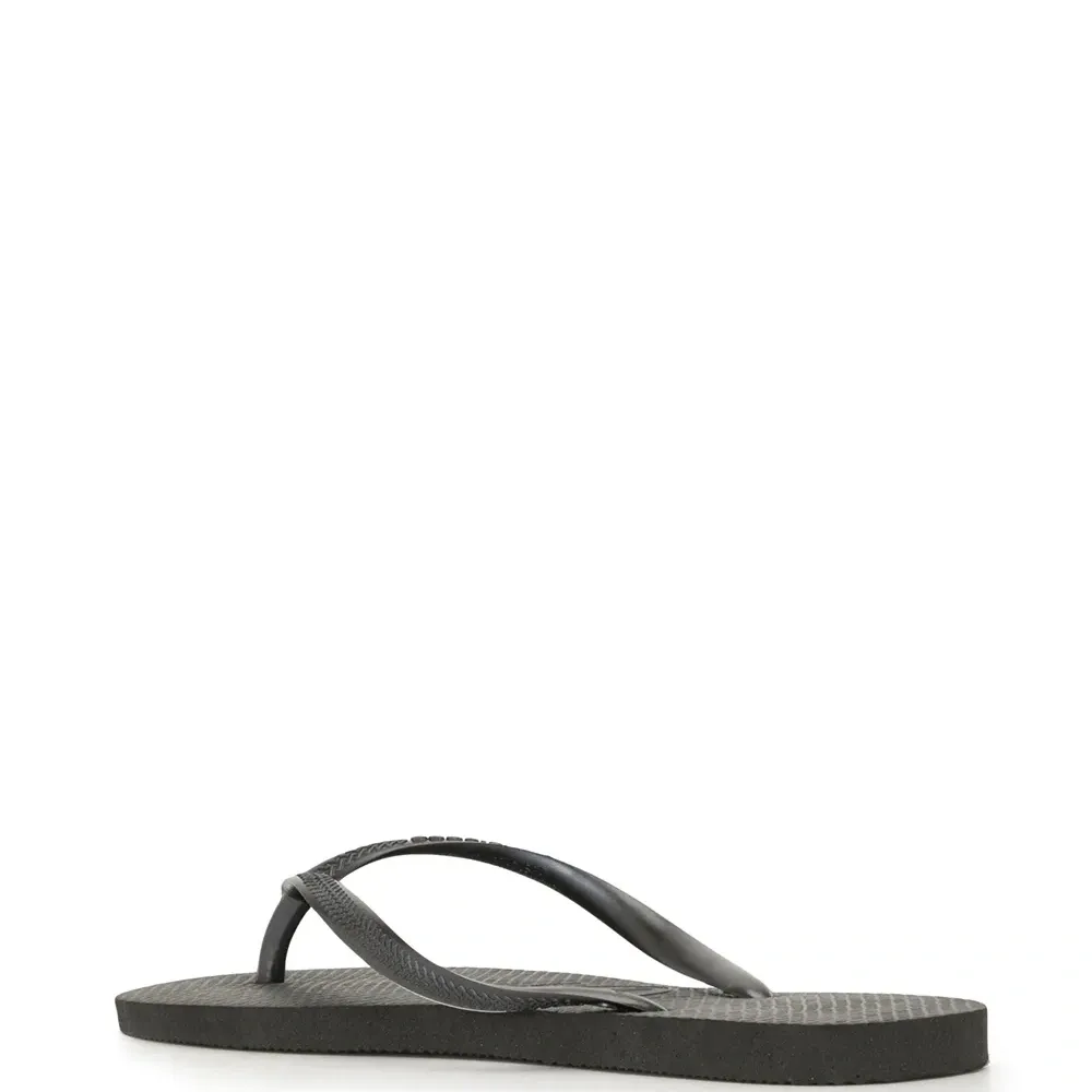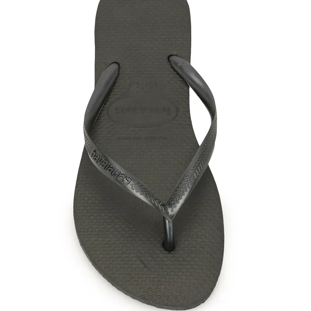 Фактурные шлепанцы Slim от Havaianas. Открытый носок, модель слип-он, без застежки, фирменная стелька и плоская подошва. Цвет: черный.