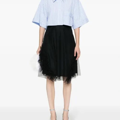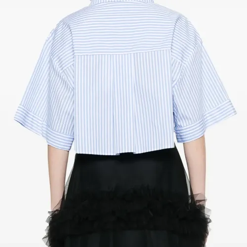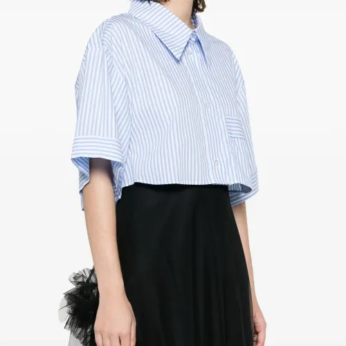 Синий/белый, органический хлопок, поплин, узор в полоску, классический воротник, короткие рукава, нагрудный накладной карман, укороченная длина и прямой подол. Узнать больше о том, какие товары получают отметку «Ответственный выбор», можно из материала «Как мы оцениваем экологичность и этичность».