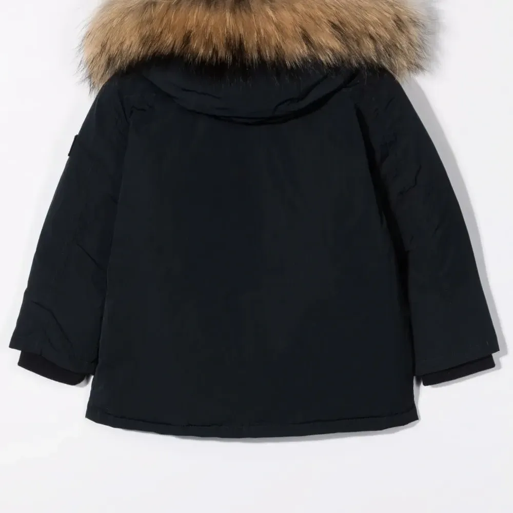 Нашивка с логотипом на рукаве, капюшон с оторочкой из искусственного меха, застежка на пуговицах спереди, длинные рукава, манжеты в рубчик, два прорезных кармана на пуговицах спереди и прямой подол. Цвет: черный.