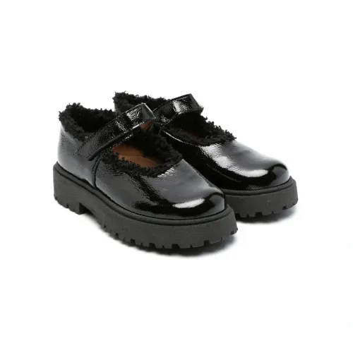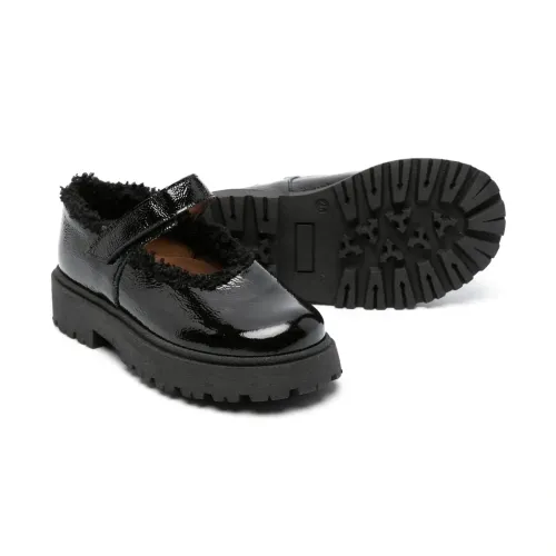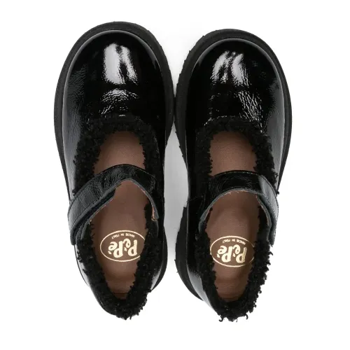 Черный, телячья кожа, лакированная отделка, жатый эффект, отделка из искусственного меха, застежка на липучке спереди, закругленный носок и рифленая резиновая подошва.
