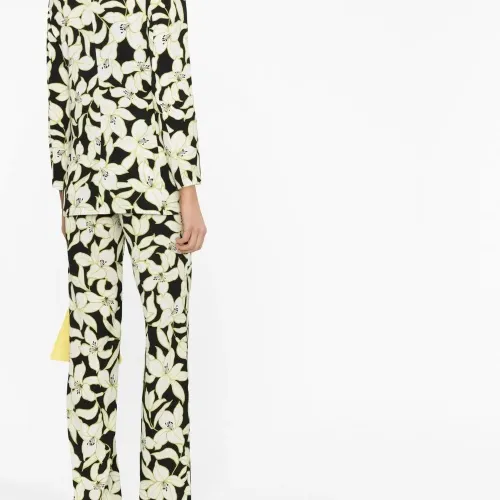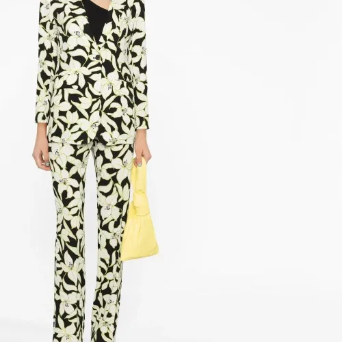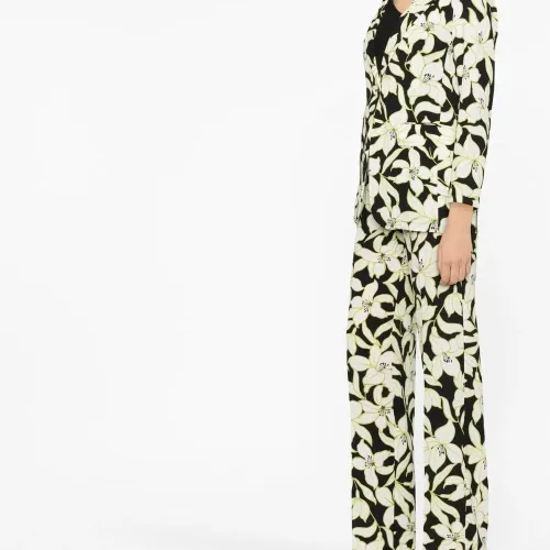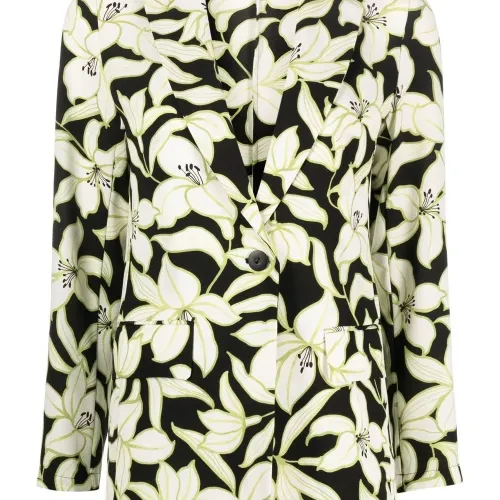 Черный, зеленый, белый, креповая текстура, сплошной цветочный принт, зазубренные лацканы, застежка на пуговицах спереди, длинные рукава, имитация кармана и без подкладки.