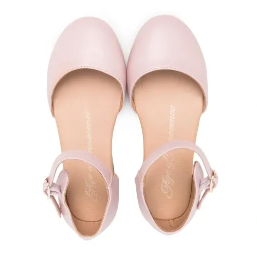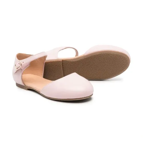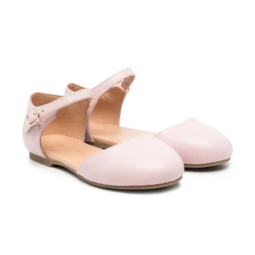 Светло-розовый, кожа, закругленный носок, ремешок на щиколотке с пряжкой и плоская подошва.