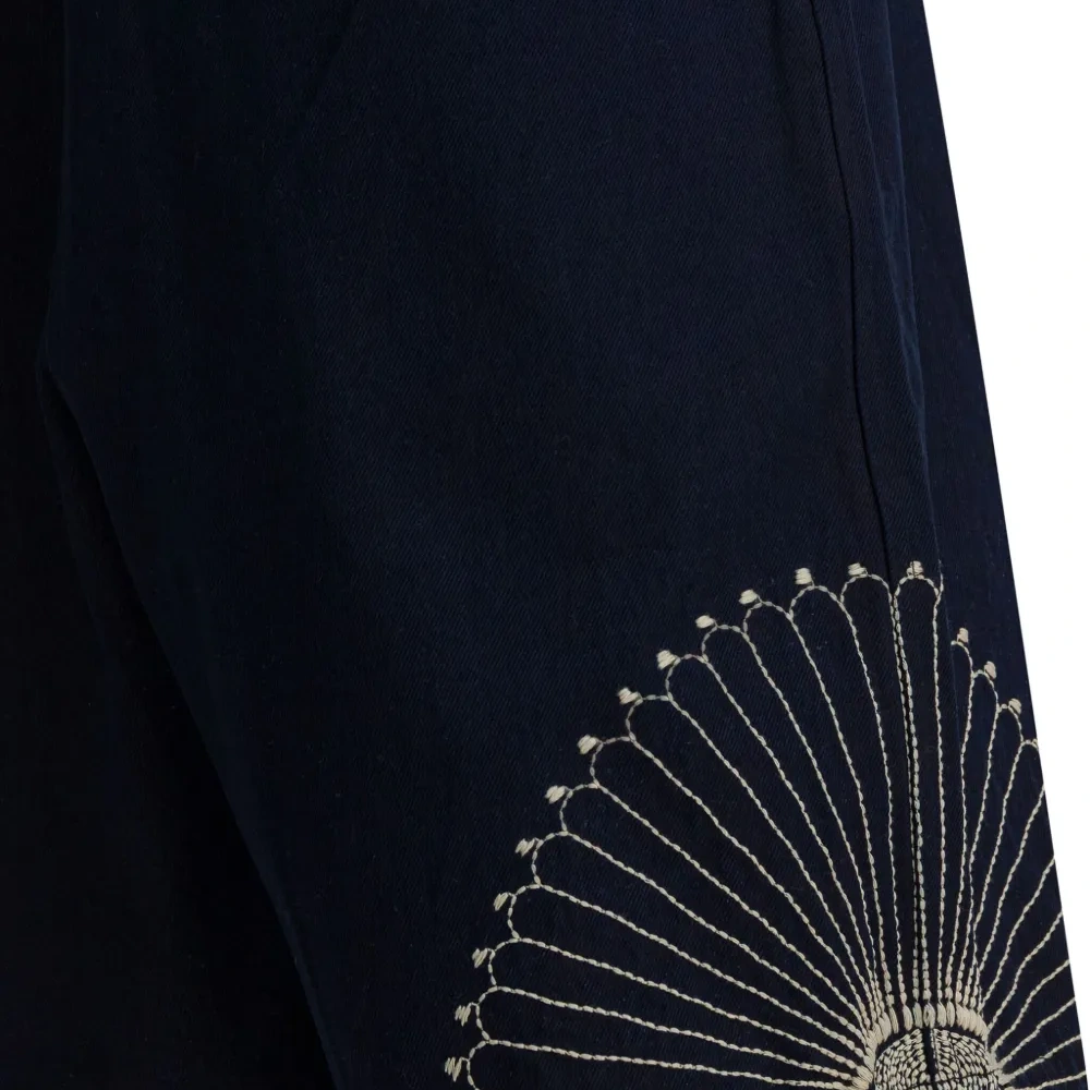 синий пояс с вышивкой, эластичный пояс на талии, задний карман на молнии, боковые карманы в швах