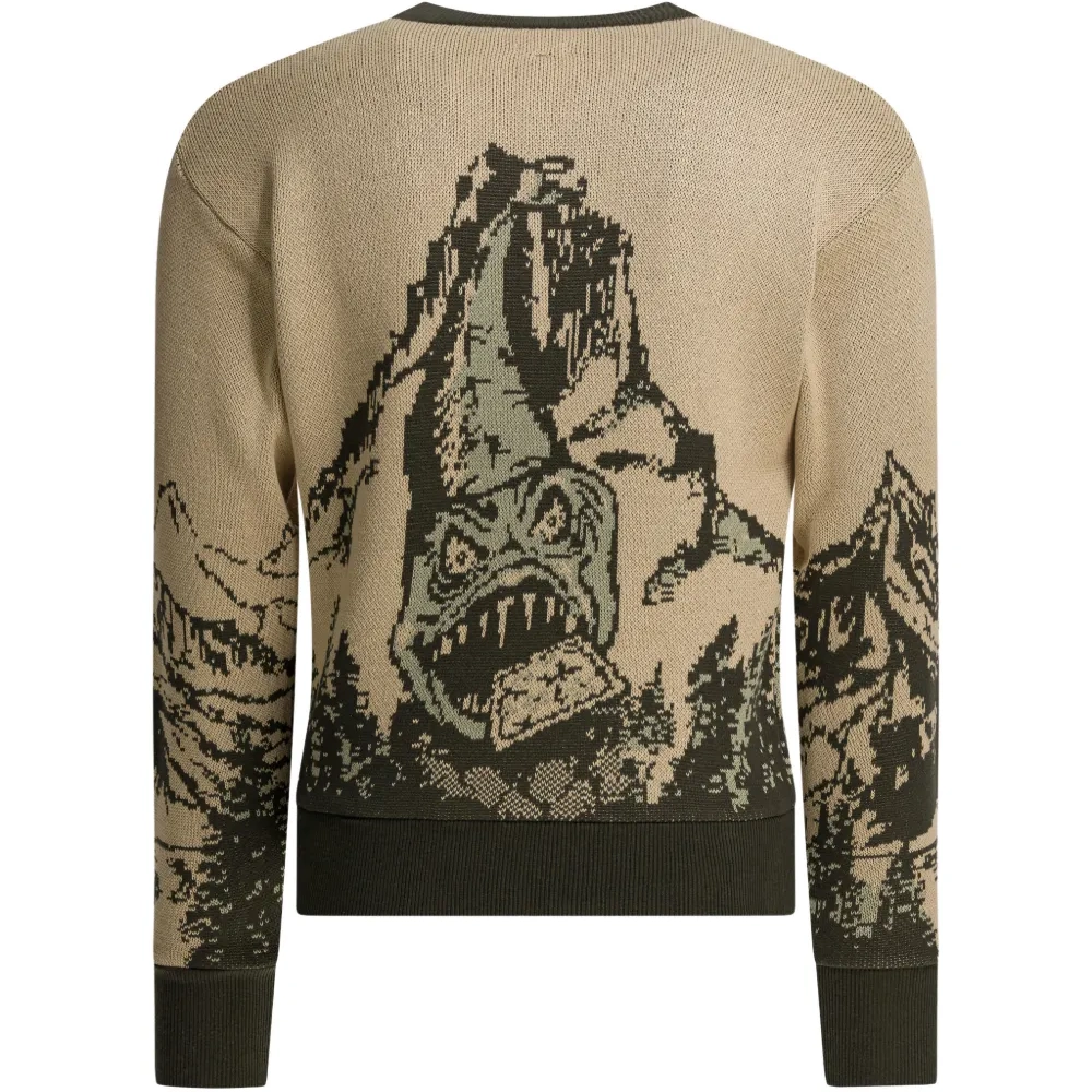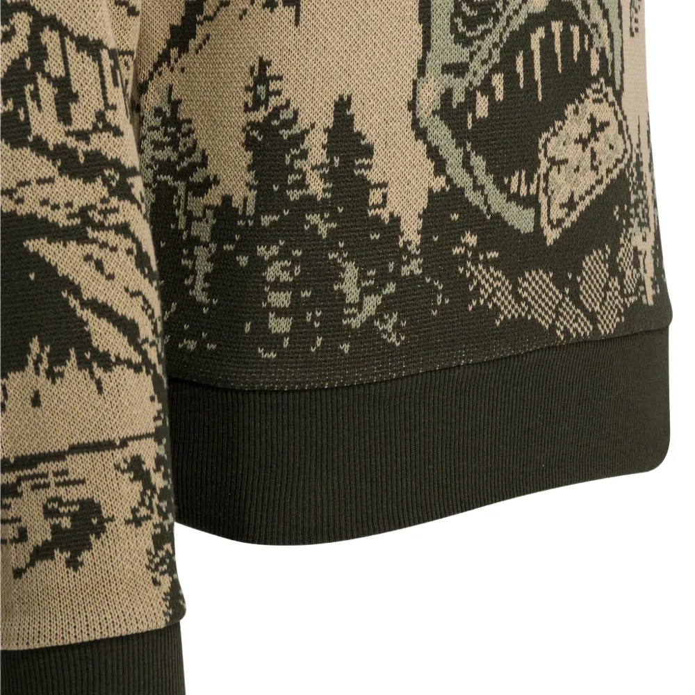 бежевый джемпер с графическим принтом, вязаной фактурой, круглым вырезом, длинными рукавами и ребристым низом