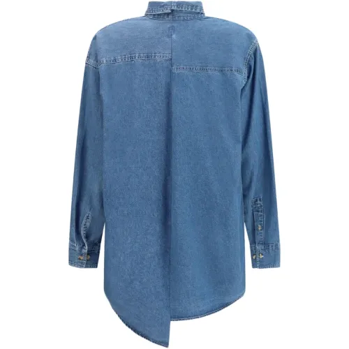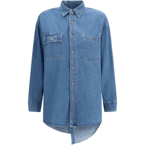 средне-синий цвет, застежка на пуговицы, классический воротник, длинные рукава, два нагрудных кармана, асимметричный низ
