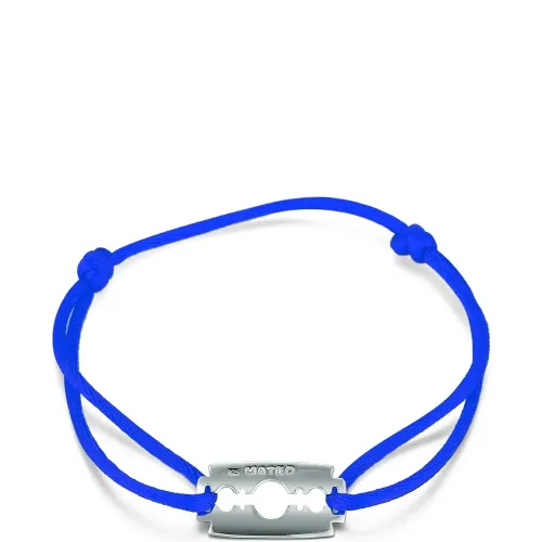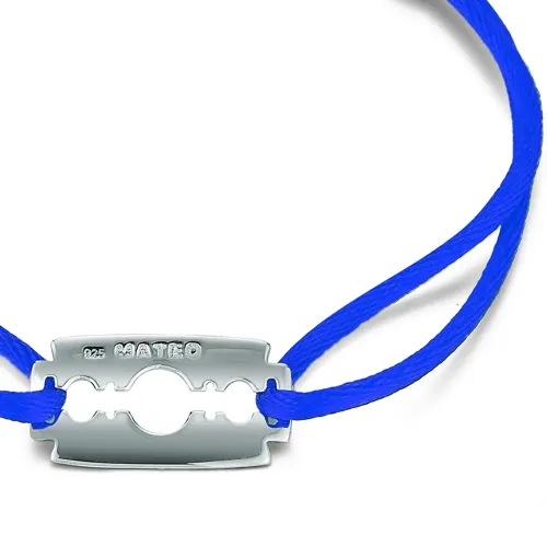 стерлинговое серебро, синяя верёвка, украшение в виде лезвия бритвы, узловая застёжка, полированная отделка