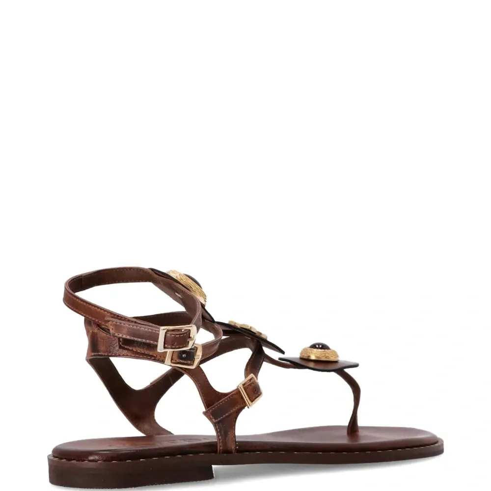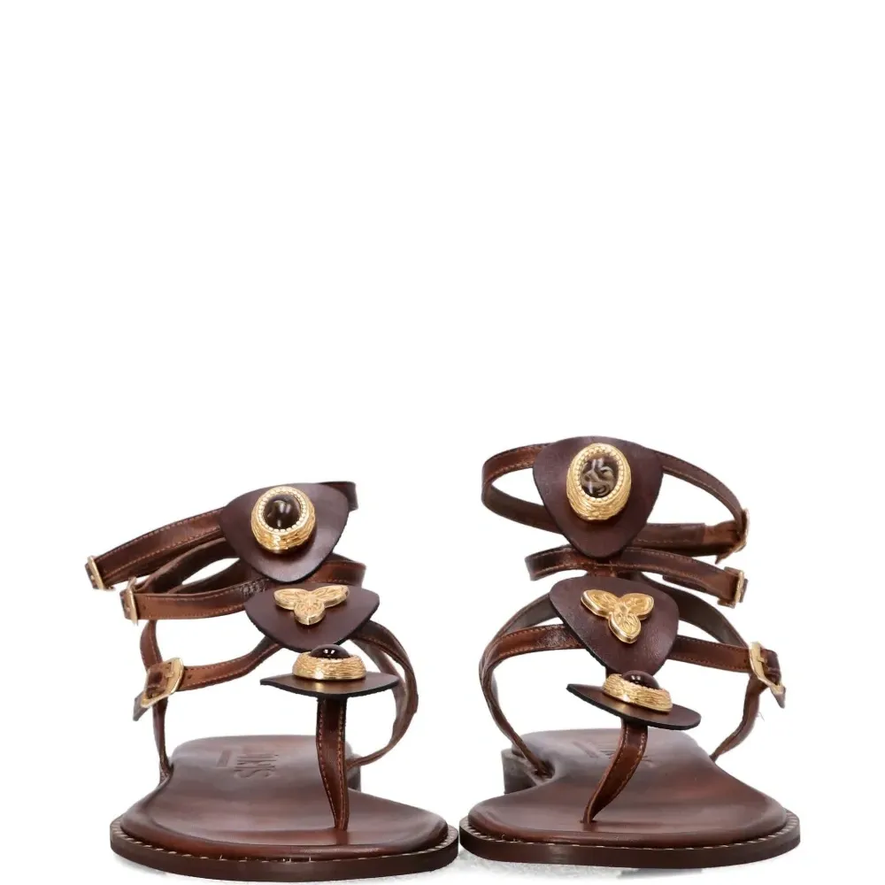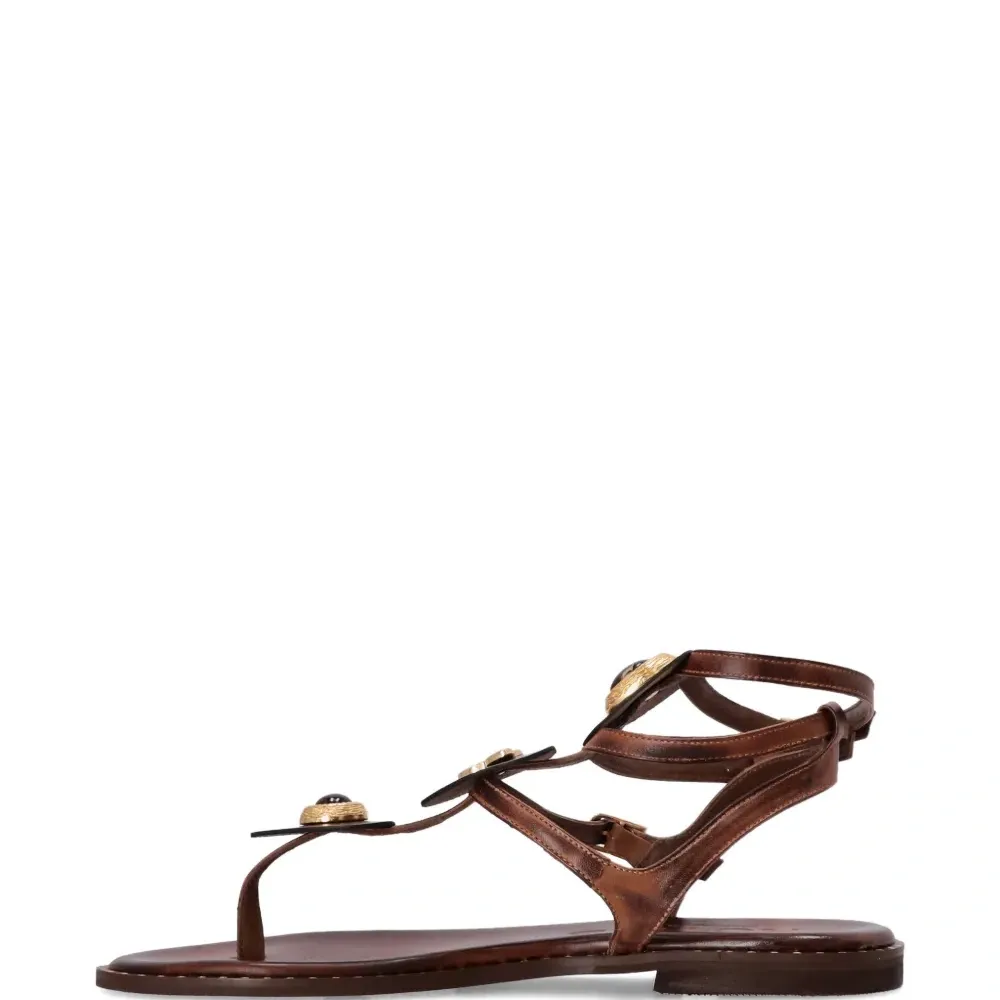 коричневый цвет, украшенные детали, застежка-пряжка, плоская подошва, ремешки