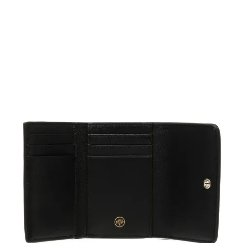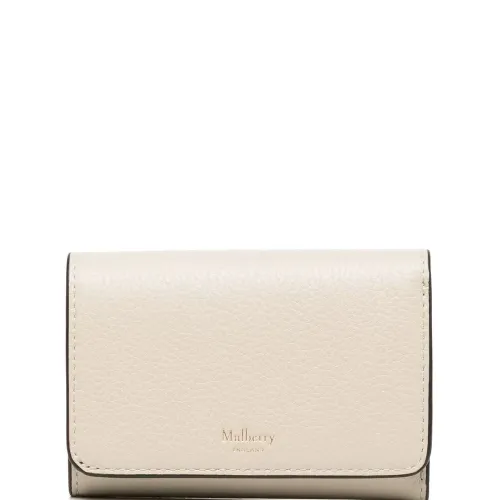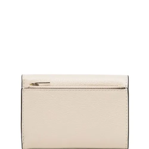 Кремово-белый, кожа, три сложения, зернистая текстура, логотип спереди, контрастная отделка, золотистая фурнитура, внутренние отделения для карт, застежка на молнии сзади и откидной верх с застежкой на кнопки.