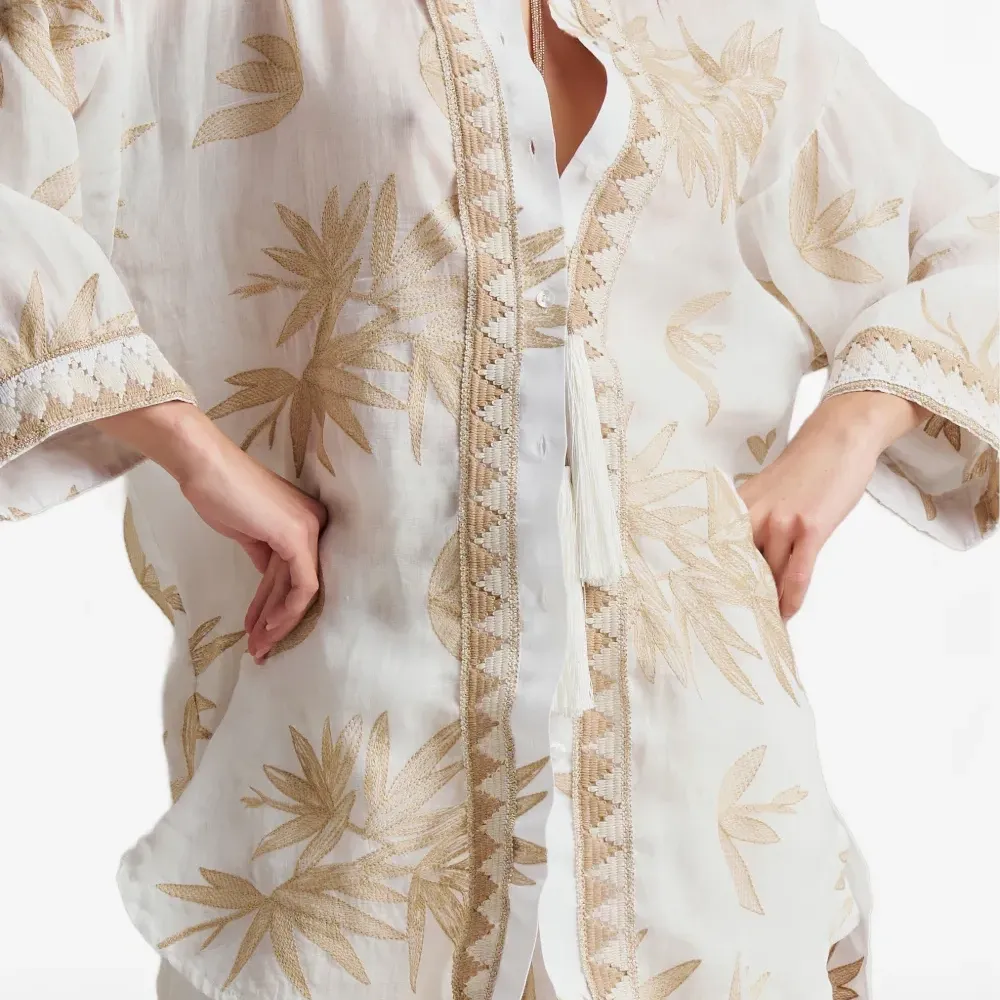 белый цветочный дизайн, вышитые детали, застежка на пуговицы, декоративные кисточки, воротник-поло