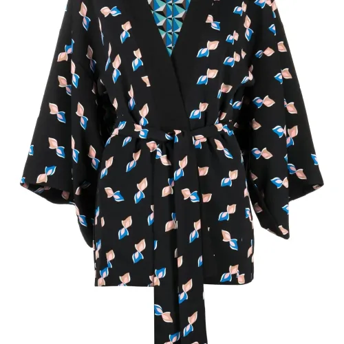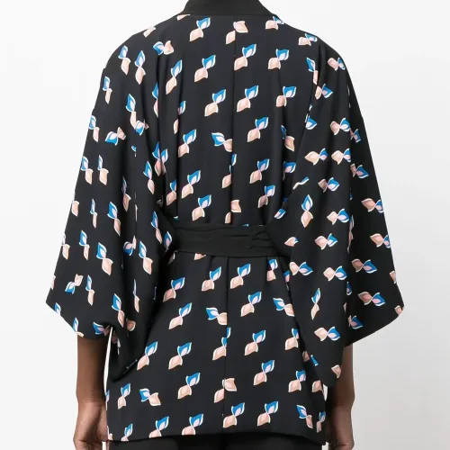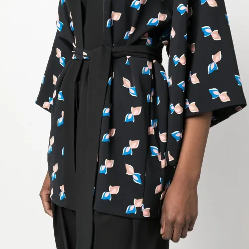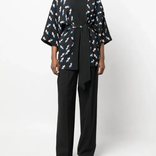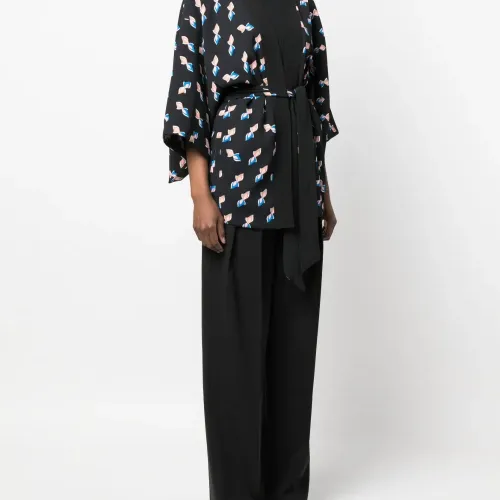 Темно-синий, сплошной графичный принт, V-образный вырез, ремень на талии и длинные широкие рукава.