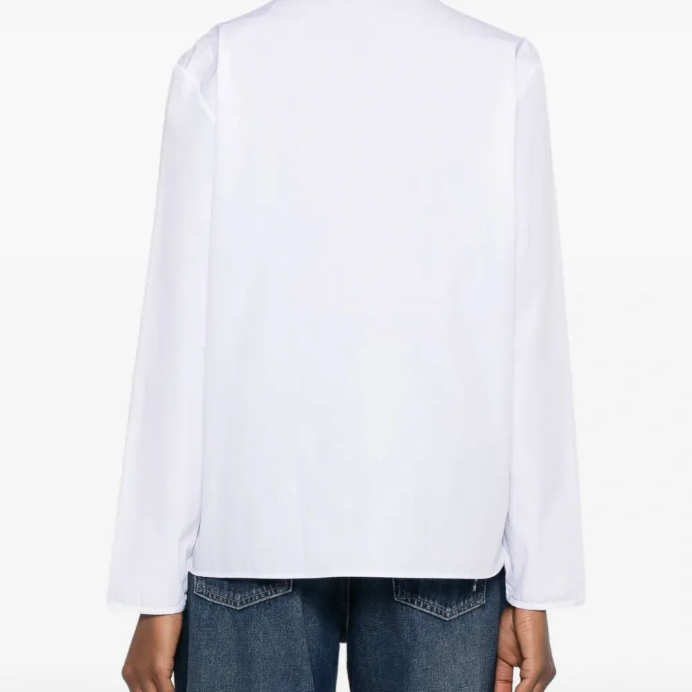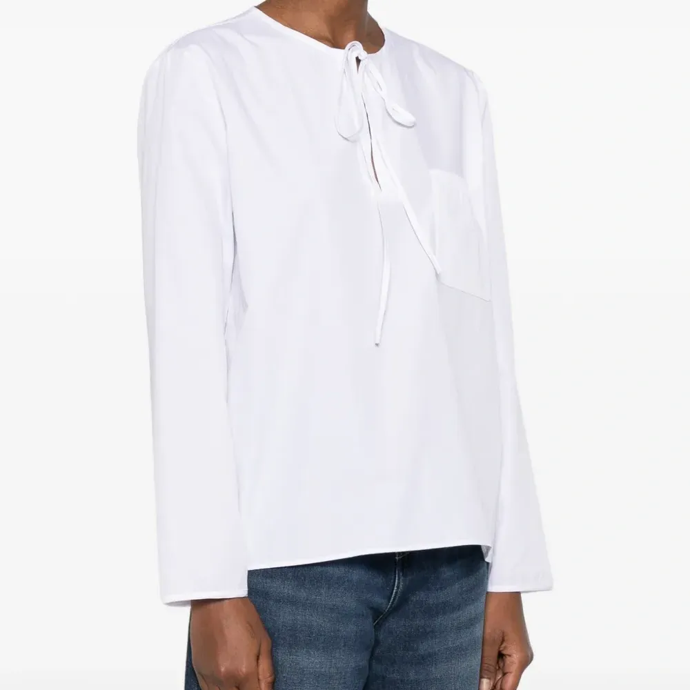 белая хлопковая футболка с круглым вырезом, длинными рукавами, завязками и нагрудным карманом