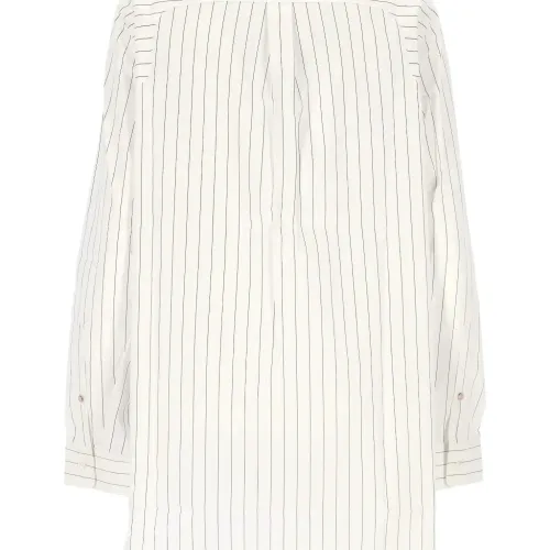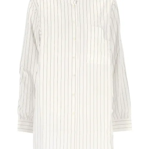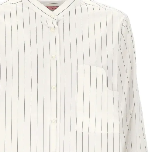белая рубашка в тонкую полоску с воротником-стойкой, нагрудным карманом, застёжкой на пуговицы и манжетами на пуговицах