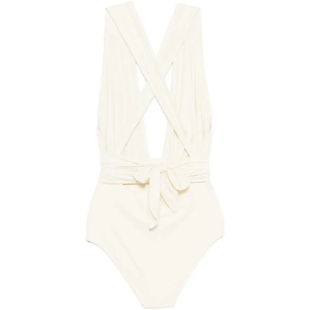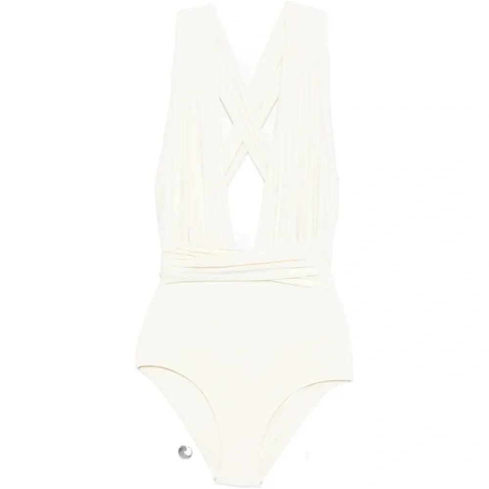 белый V-образный вырез, завязки на плечах. Пожалуйста, примерьте купальник поверх собственного белья.