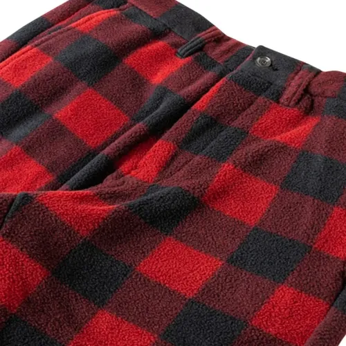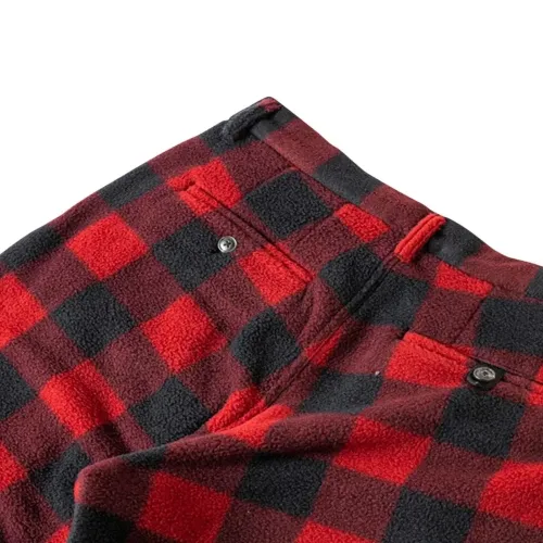 Клетчатый узор, петли для ремня, застежка на пуговицах спереди, два кармана по бокам, два кармана на пуговице сзади и прямой крой.