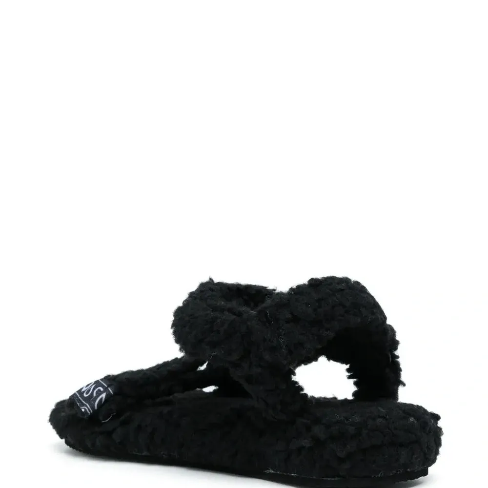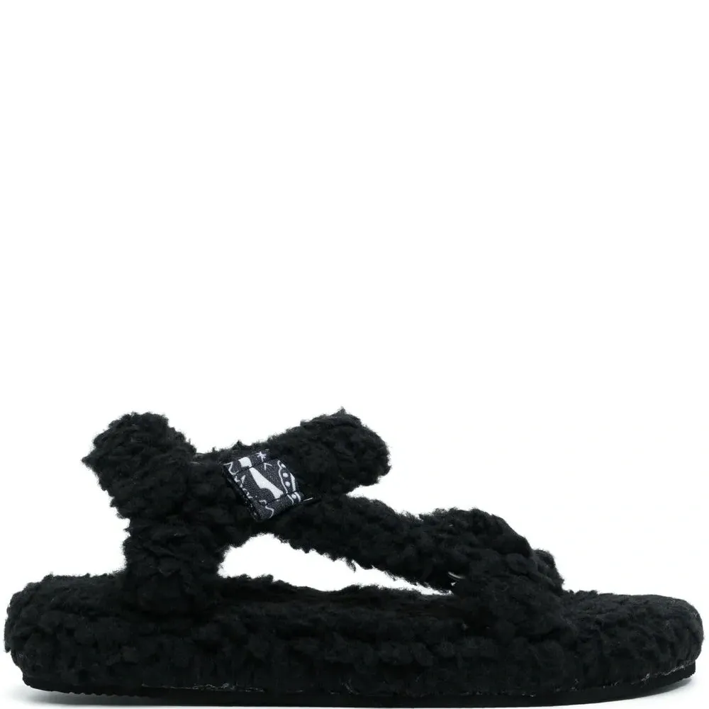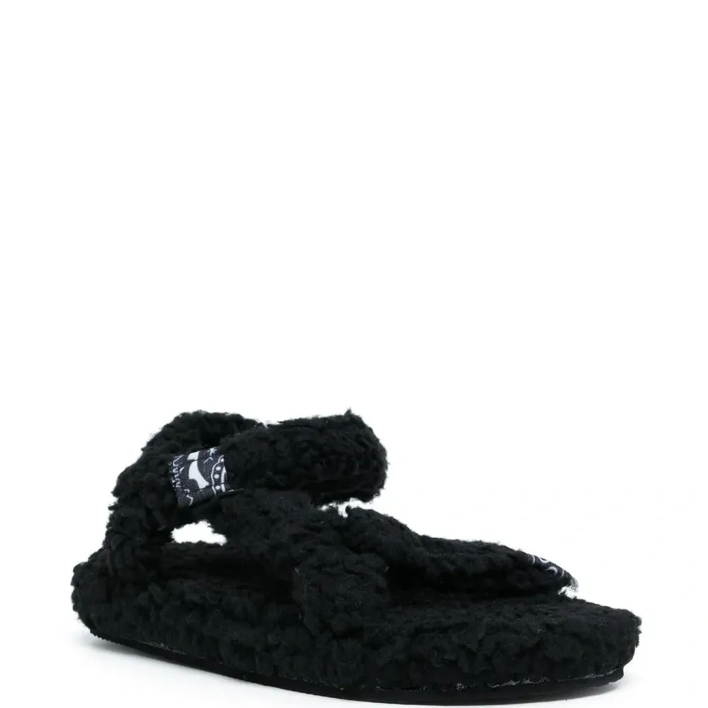 Отделка из искусственного меха, нашивка с логотипом сбоку, открытый носок, застежка на липучке сбоку, стелька с логотипом и плоская резиновая подошва.