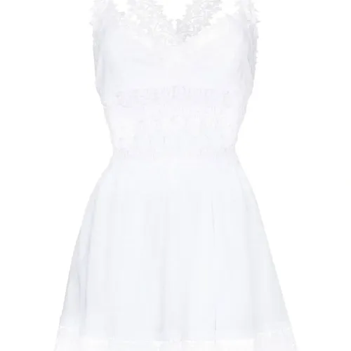 Белый, смесовый хлопок, перекрестные ремешки, без рукавов, кружевная отделка, V-образный вырез, расклешенная юбка и подол с фестонами.
