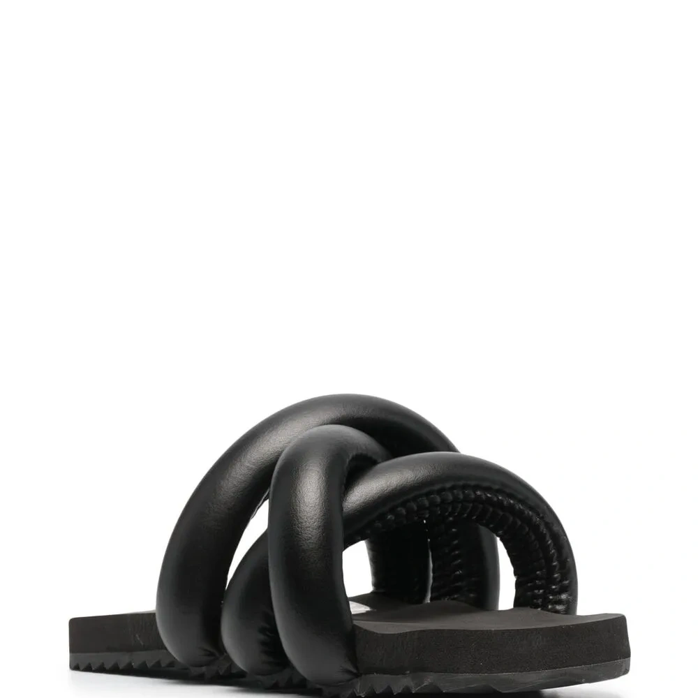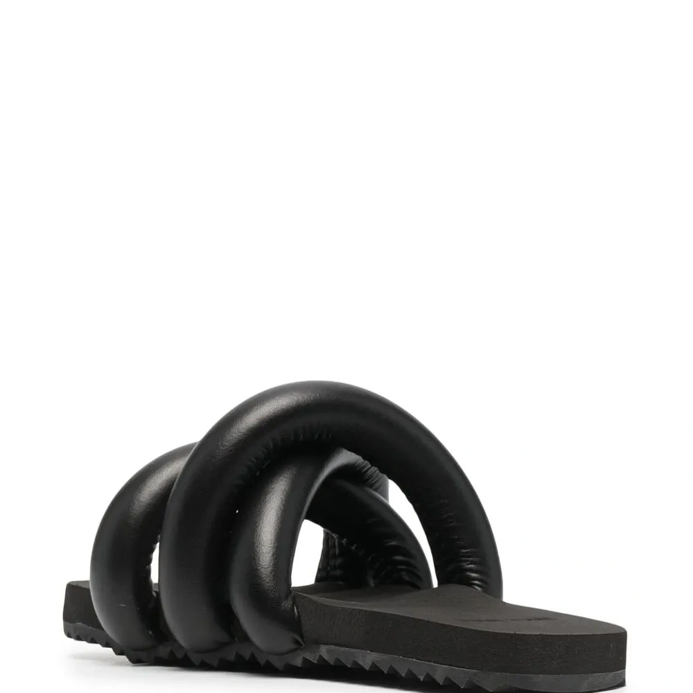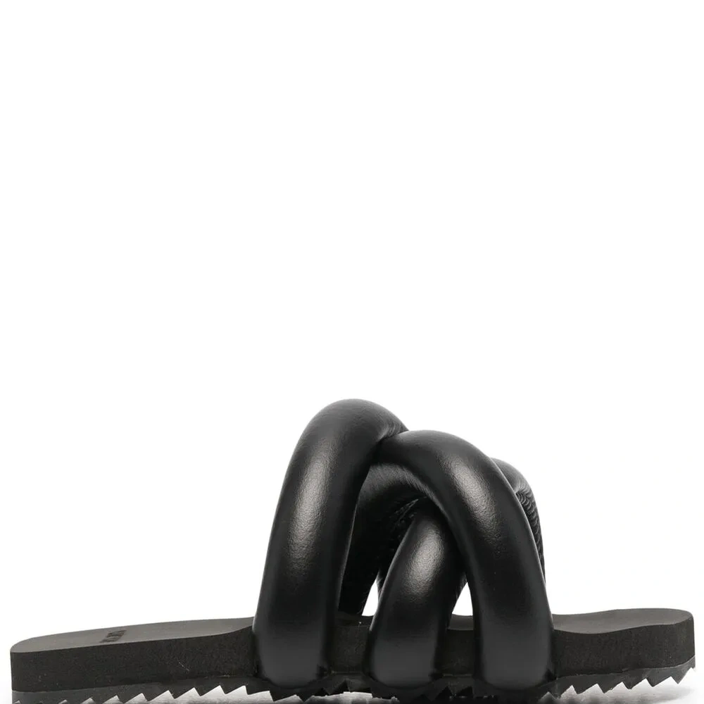 Перекрестные ремешки, открытый носок, стелька с логотипом, модель без застежки и резиновая подошва. Цвет: черный.