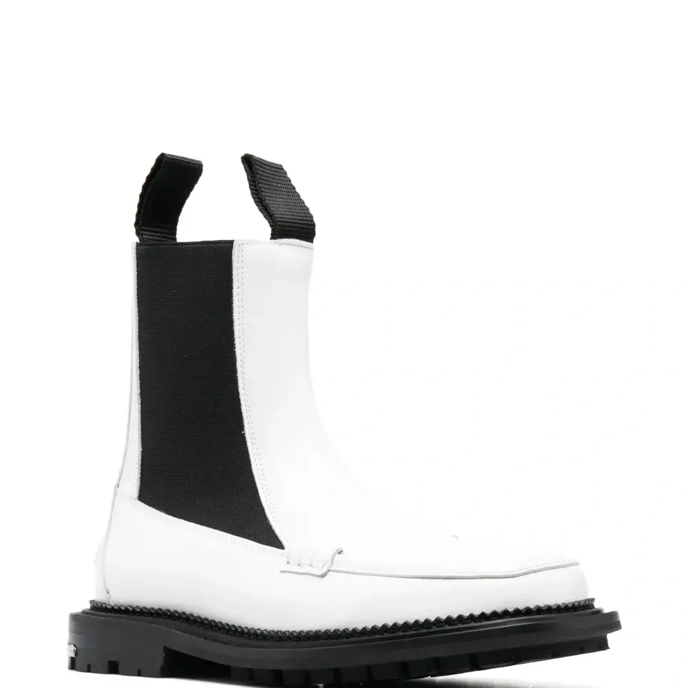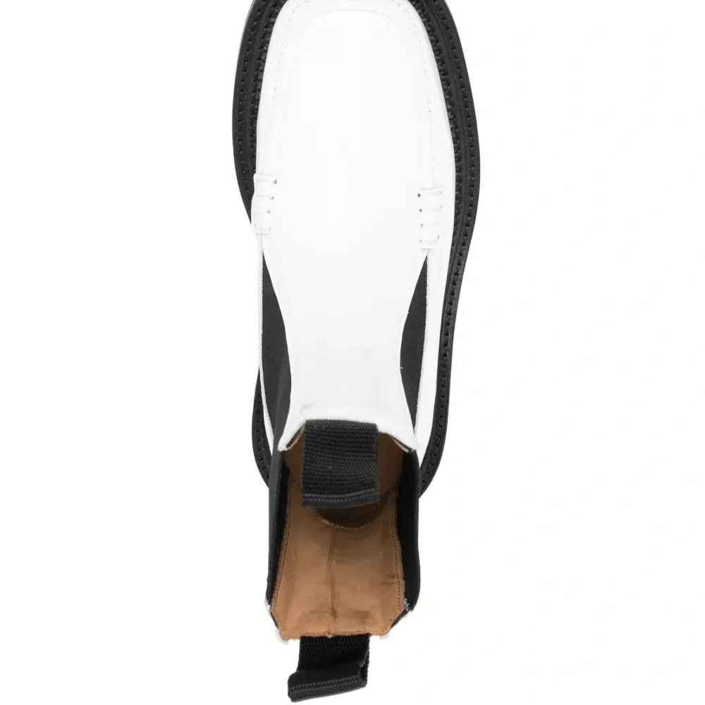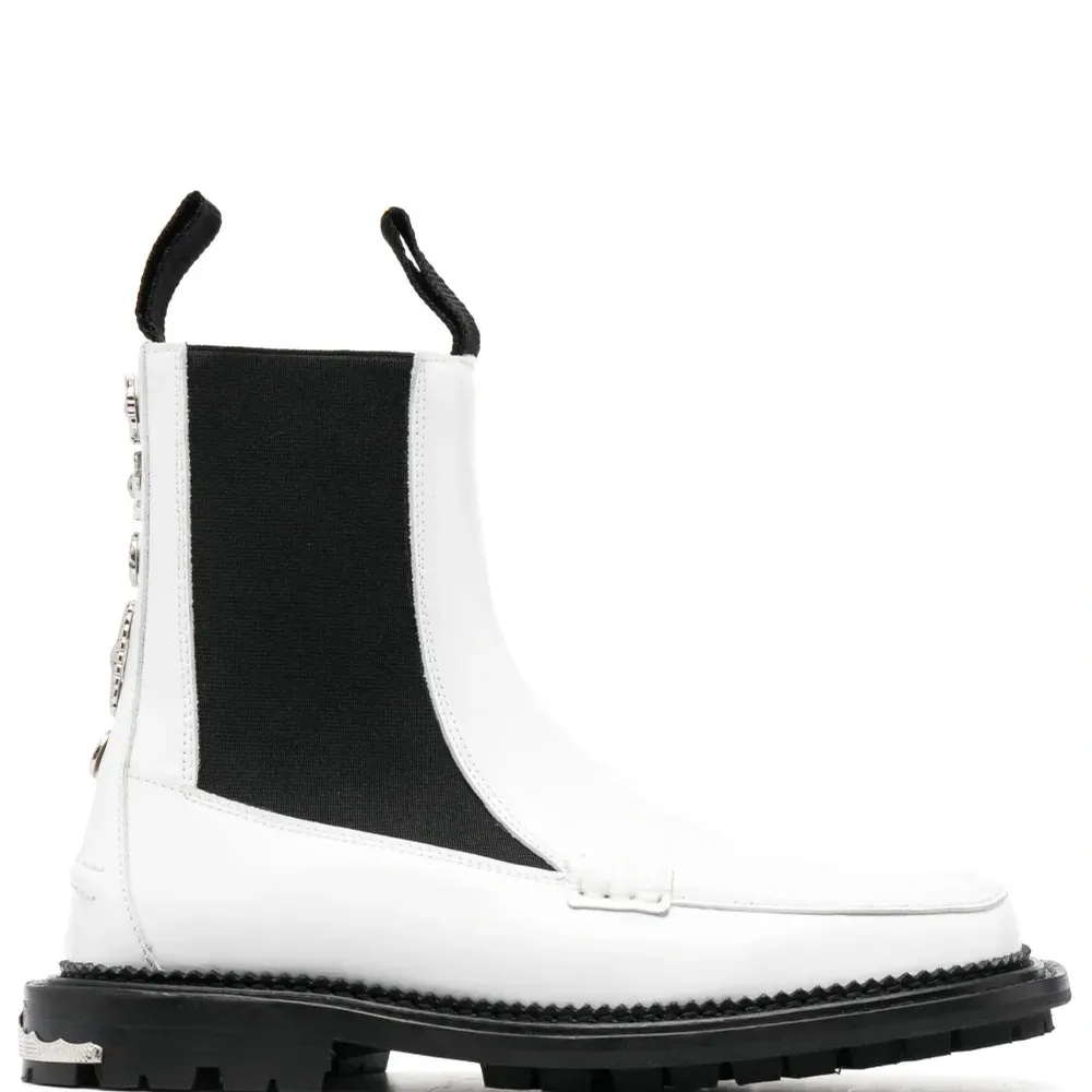 Белый/черный, кожа, квадратный носок, серебристые заклепки, эластичные боковые вставки, двойная петля для подтягивания, вставка с эффектом металлик на пятке и плоская подошва.