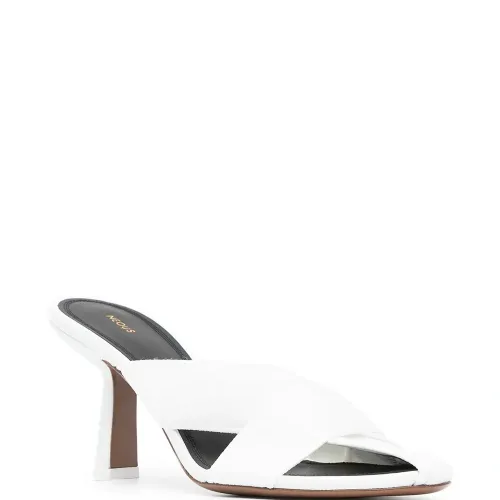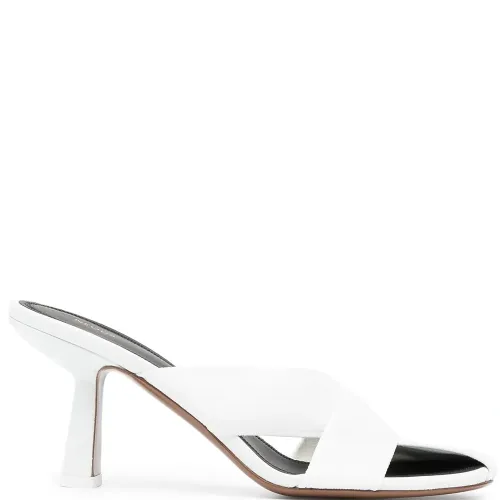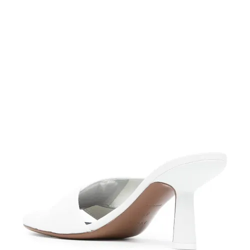 Вырезные детали, закругленный носок, модель без застежки, стелька с логотипом и скульптурный каблук средней высоты.