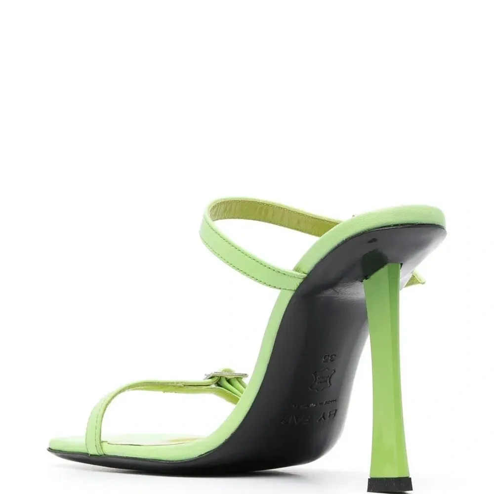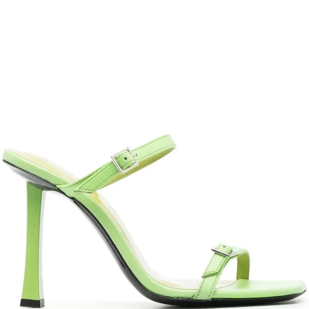 Телячья кожа, два ремешка с застежкой на пряжке, открытый носок и высокий скульптурный каблук.
